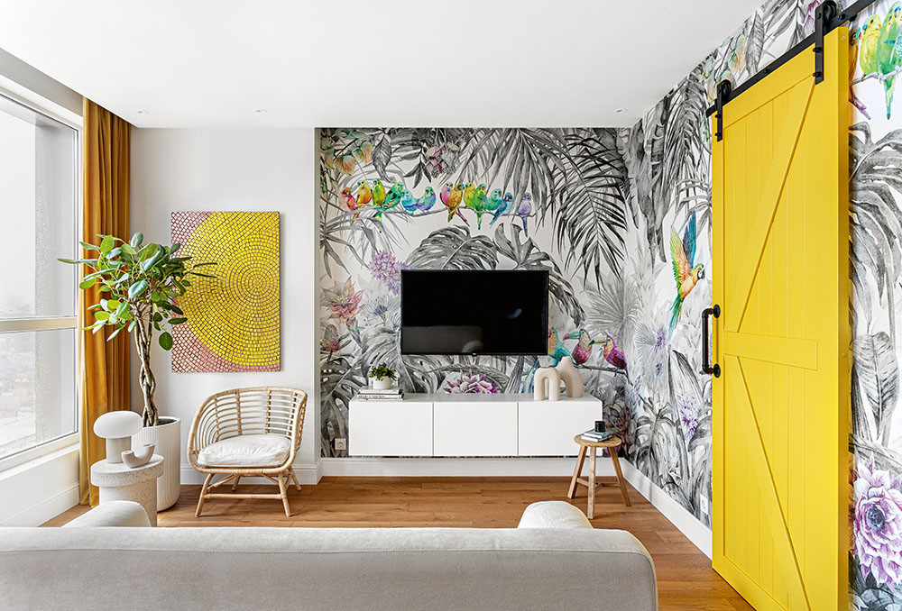 В этой небольшой однокомнатной квартире правильных пропорций и конфигурации сложилось эргономичное, уравновешенное пространство. Оно словно заполнено солнечным светом, льющимся из трёх панорамных окон. Интерьер, созданный, чтобы вдохновлять молодую творческую натуру, ярок, смел и свободен. Артистизма, лёгкой расслабленности и даже некоторой небрежности ему добавляют элементы эстетики бохо.