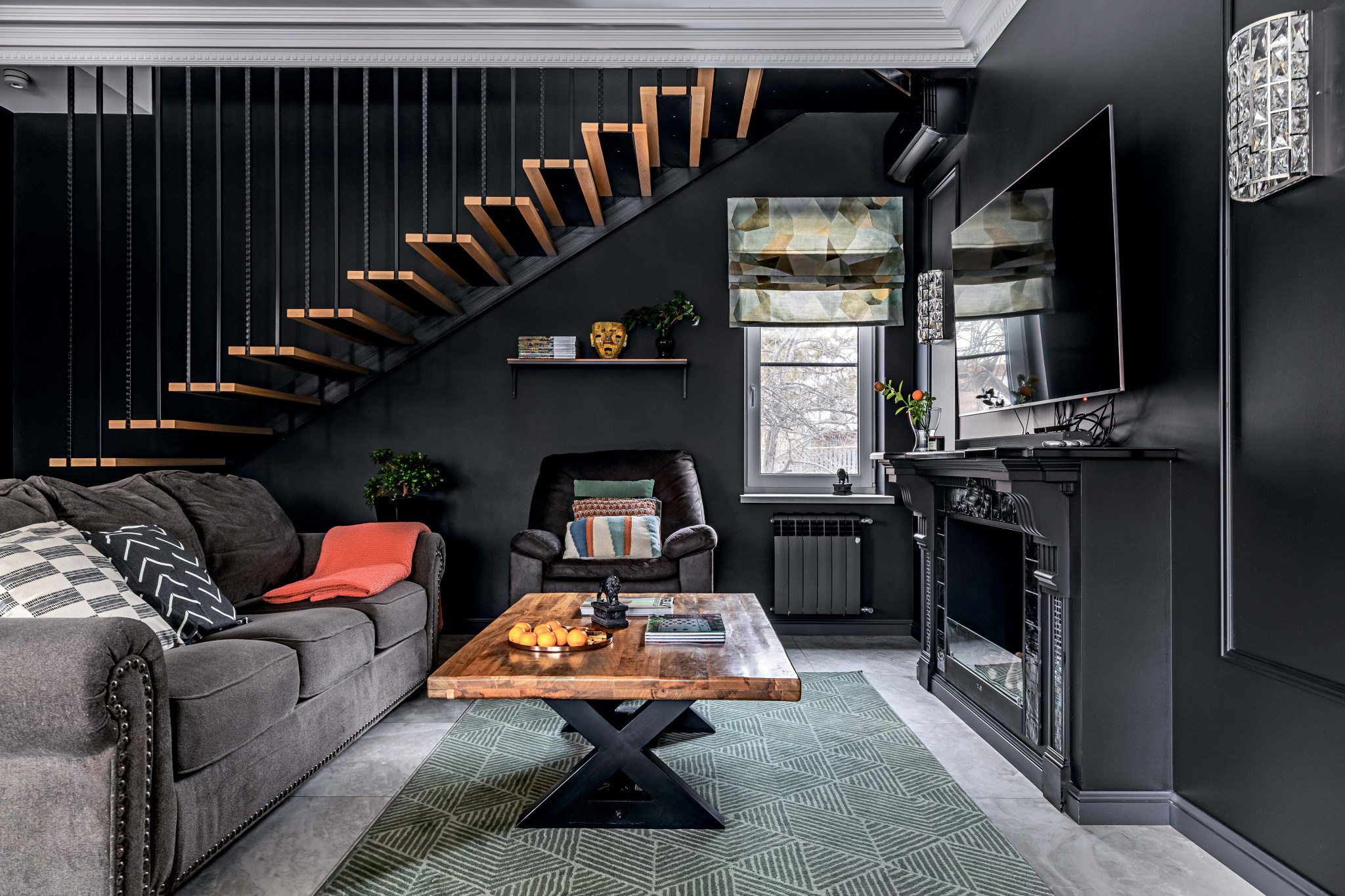 Насыщенная палитра интерьера таунхауса поражает воображение. Особенно показательна кухня-гостиная, выдержанная в чёрном цвете. Total-black размывает границы не слишком большого помещения. Пространство смотрится невероятно декоративным даже без обилия аксессуаров