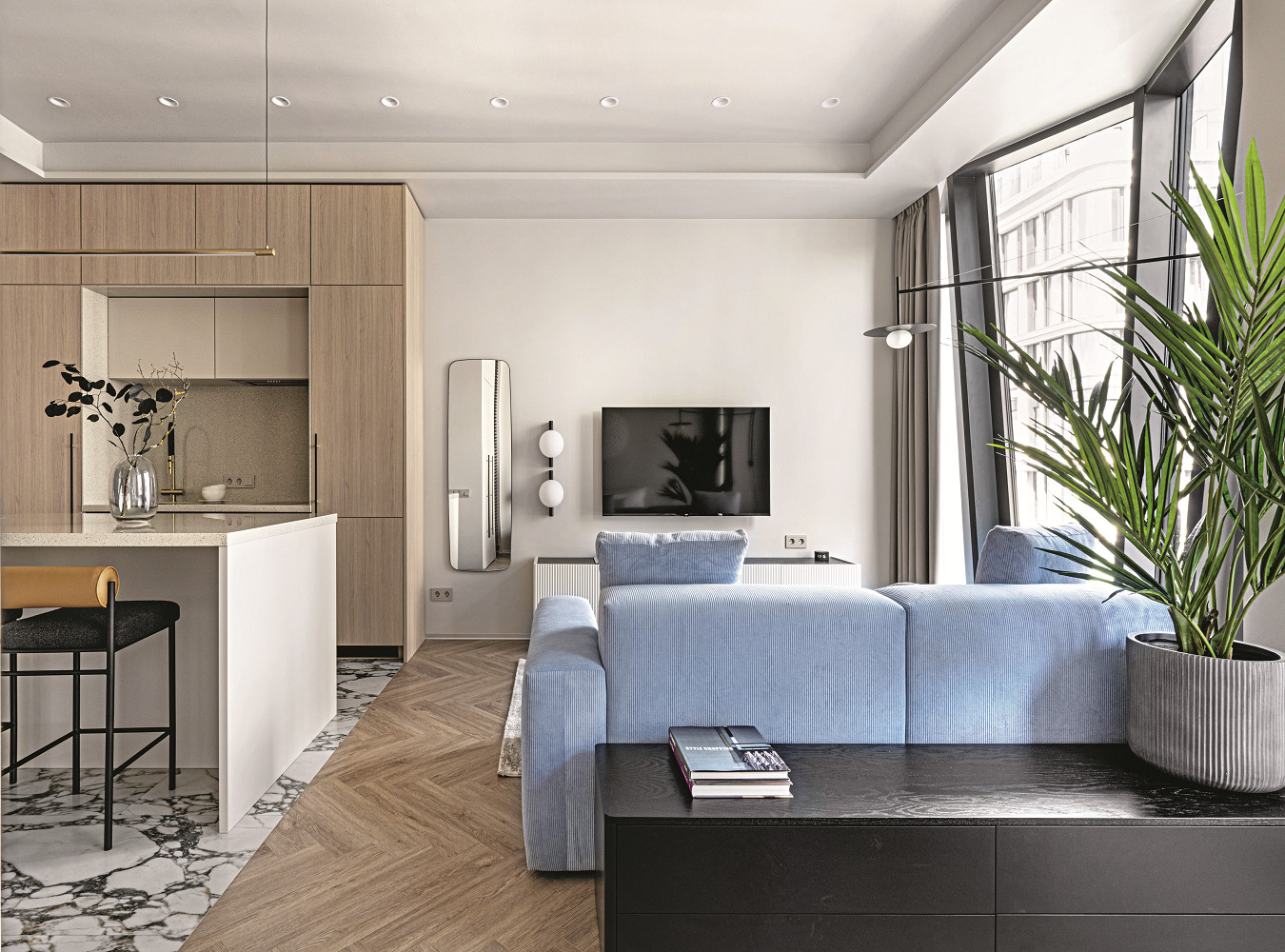 Евродвушку в Тверском районе Москвы молодая женщина приобрела как выгодную инвестицию. Удачное расположение недалеко от Белорусского вокзала, на месте снесённых корпусов часового завода «Слава», сулило высокий спрос на аренду. Несмотря на то что квартира сдавалась застройщиком в отделке white box, заказчица решилась на перепланировку. Её не устраивали тесные помещения, нравились просторные квартиры-студии и авторский дизайн. Для осуществления проекта были приглашены знакомые архитекторы-дизайнеры.