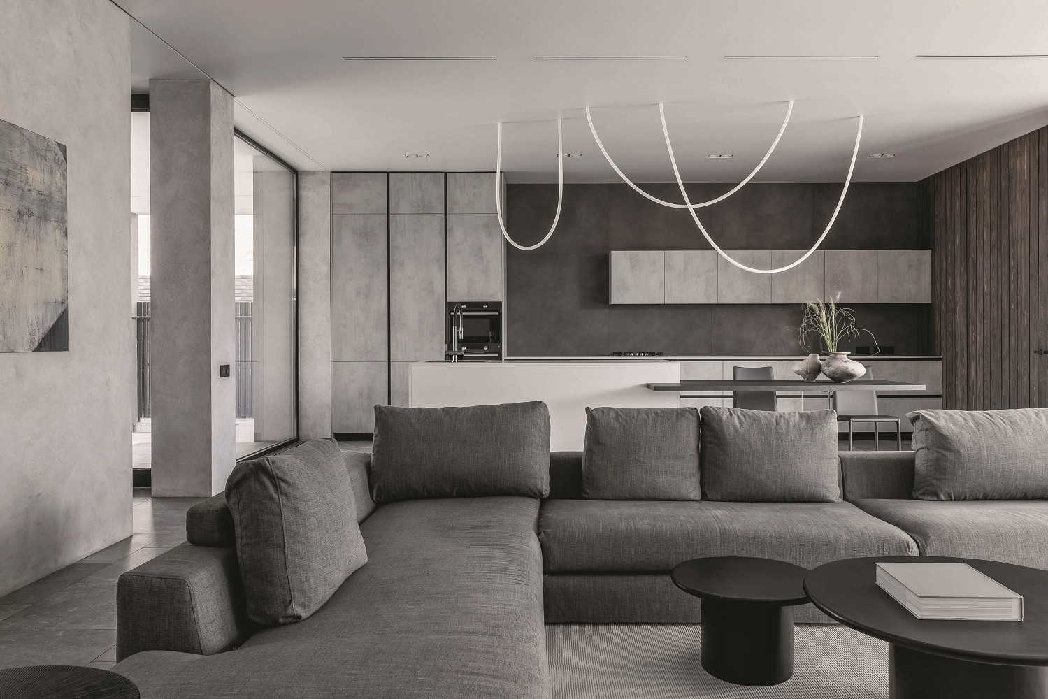 Во всех помещениях архитекторы стремились создать ощущение спокойного, «обнимающего» интерьера, поэтому отдали предпочтение материалам обволакивающих серых тонов. Основную гамму дополняют выразительные каменные фактуры и древесные текстуры