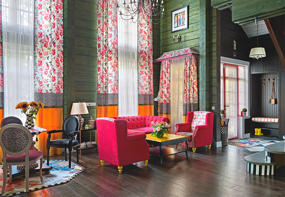Загородный дом, сочетающий в своём облике элементы русской усадьбы и английского коттеджа, расположен в Сергиево-Посадском районе Московской области — одном из самых живописных и исторически значимых уголков Подмосковья. Хозяева — супружеская пара с дочерьми, двумя молодыми девушками, — постоянно проживают в городской квартире, а сюда приезжают на выходные. Именно это обстоятельство позволило оформить интерьер дома как яркое, нестандартное пространство: интерьер-впечатление, интерьер-праздник, призванный вдохновлять и дарить всей семье незабываемые эмоции.