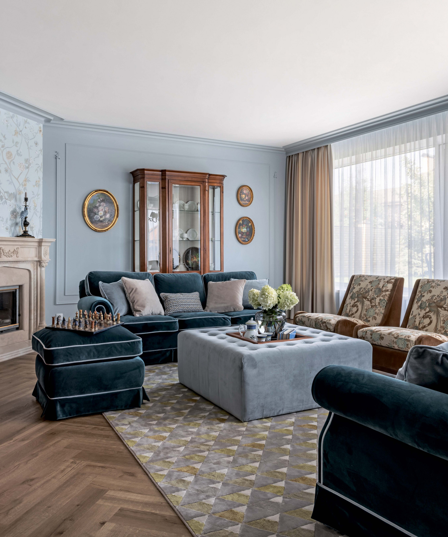 Обстоятельства сложились таким образом, что семье заказчика из четырёх человек (супруги, их взрослый сын и пожилая мать владелицы) требовалось переехать в загородный дом в очень сжатые сроки. На строительство времени не было, поэтому наши герои приобрели готовую постройку, требующую незначительной переделки и ремонта. Дизайнера попросили создать «свежий» интерьер — такой, чтобы дом выглядел одновременно и новым, и знакомым. За основу взяли семейные реликвии: антикварную мебель, посуду, картины и аксессуары — и подобрали для них идеальный фон.