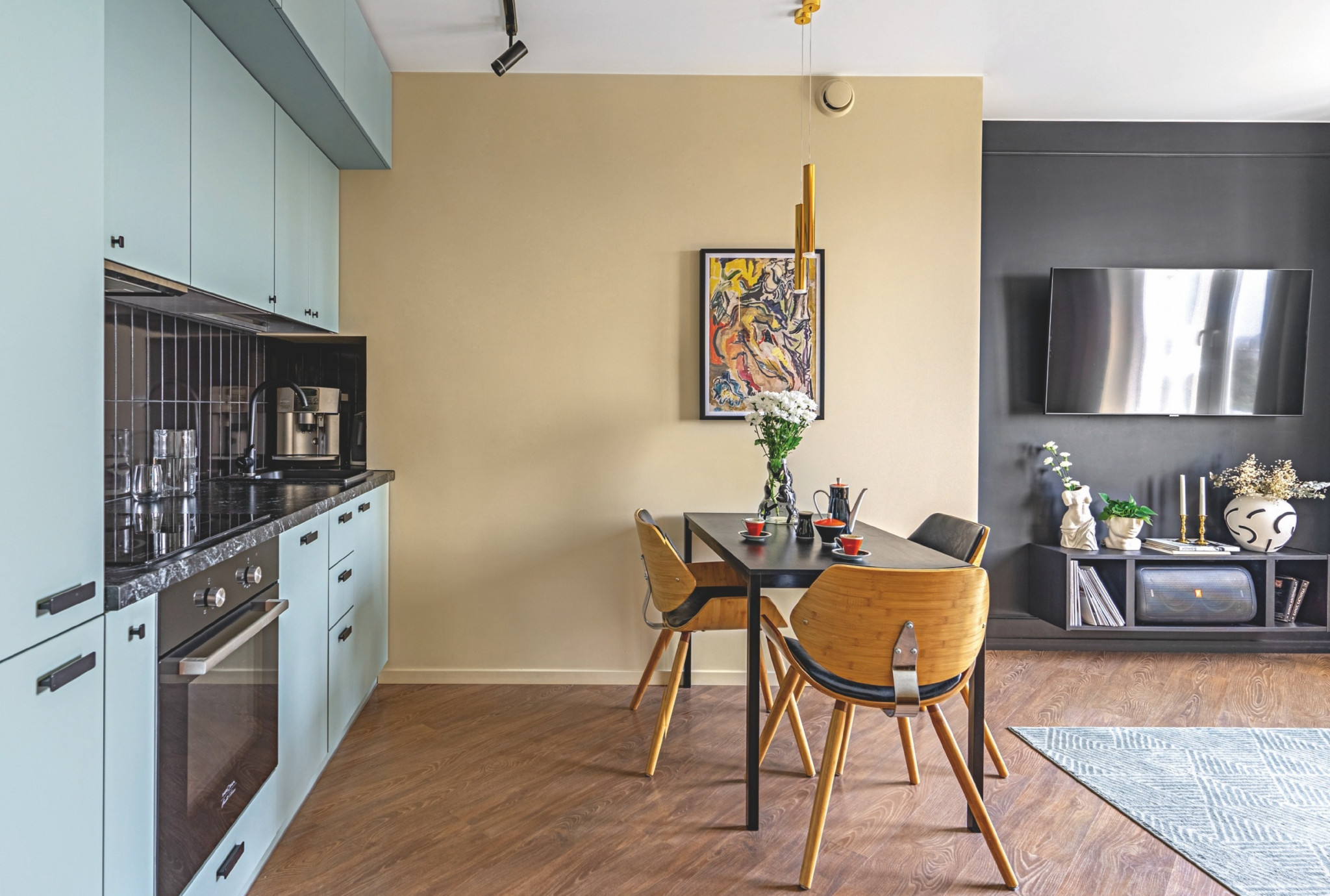 Одно из главных достоинств однокомнатной квартиры, расположенной на 16-м этаже дома в Казани, — живописные виды на панораму города, достопримечательности центральной части, акваторию реки Казанки и мост Миллениум. Для молодой пары, новых владельцев квартиры, была важна и максимальная близость к бизнес-центру, где расположен их офис.