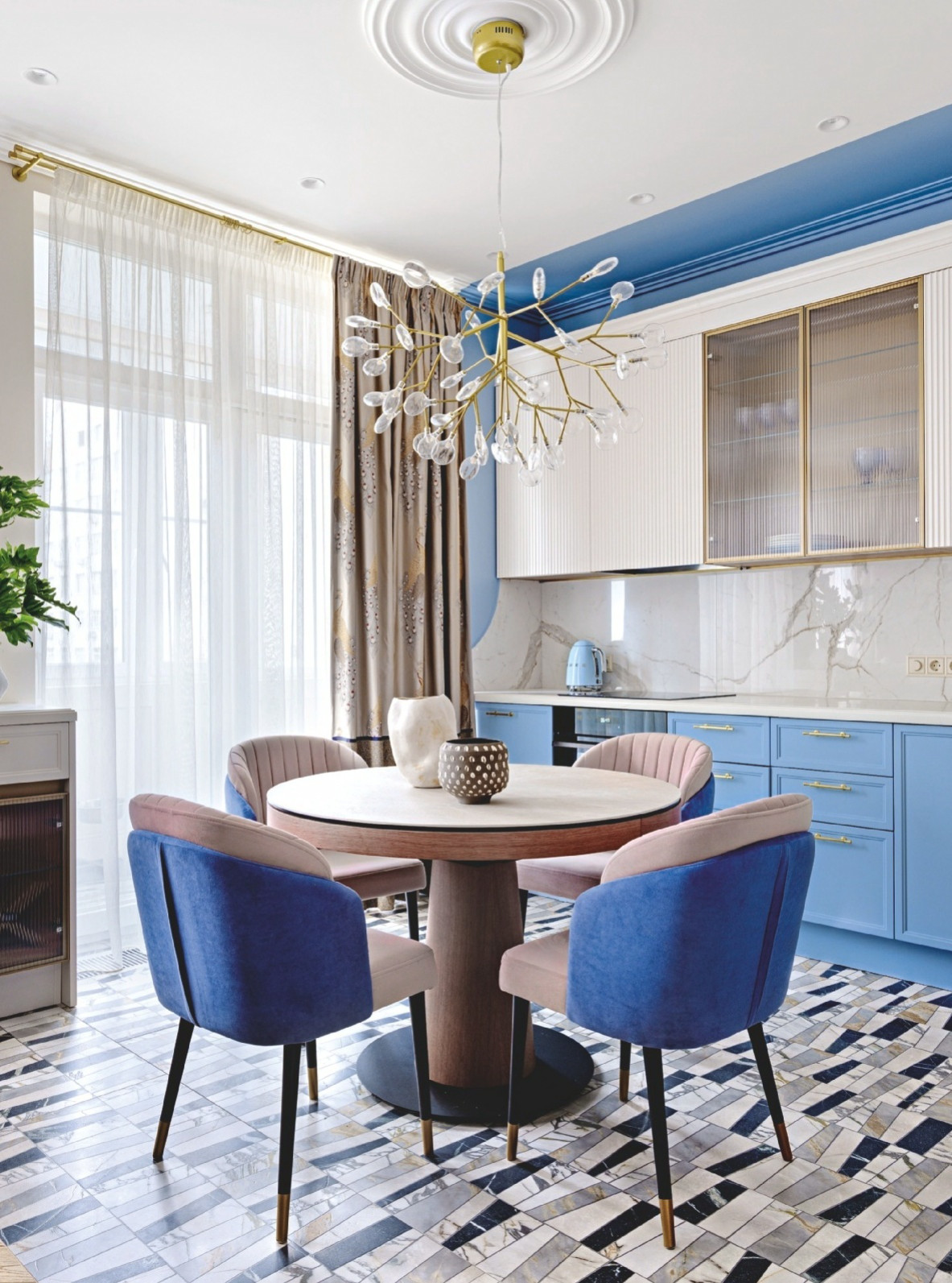 Интерьер представляет собой эклектику с элементами классики. Сложные оттенки синего и голубого — лейтмотив всей квартиры, и кухня органично продолжает концепцию: стену и часть потолка выкрасили в тот же цвет, что и фасады, и добавили стулья в серо-голубой обивке. В итоге кухня выглядит не как отдельный технический блок, а как стильный элемент, мягко интегрированный в гостиную. Благодаря такому приёму в пространстве есть ощущение лёгкости и уюта. Планировку кухни продиктовал большой холодильник Side-by-Side, который хотели заказчики. Сначала придумали, как грамотно его замаскировать в нише, а уже потом вокруг достроили остальное. Кухня компактная, а в таком помещении эргономика должна быть просто идеальной: раковина, рабочая зона, варочная панель — всё под рукой.