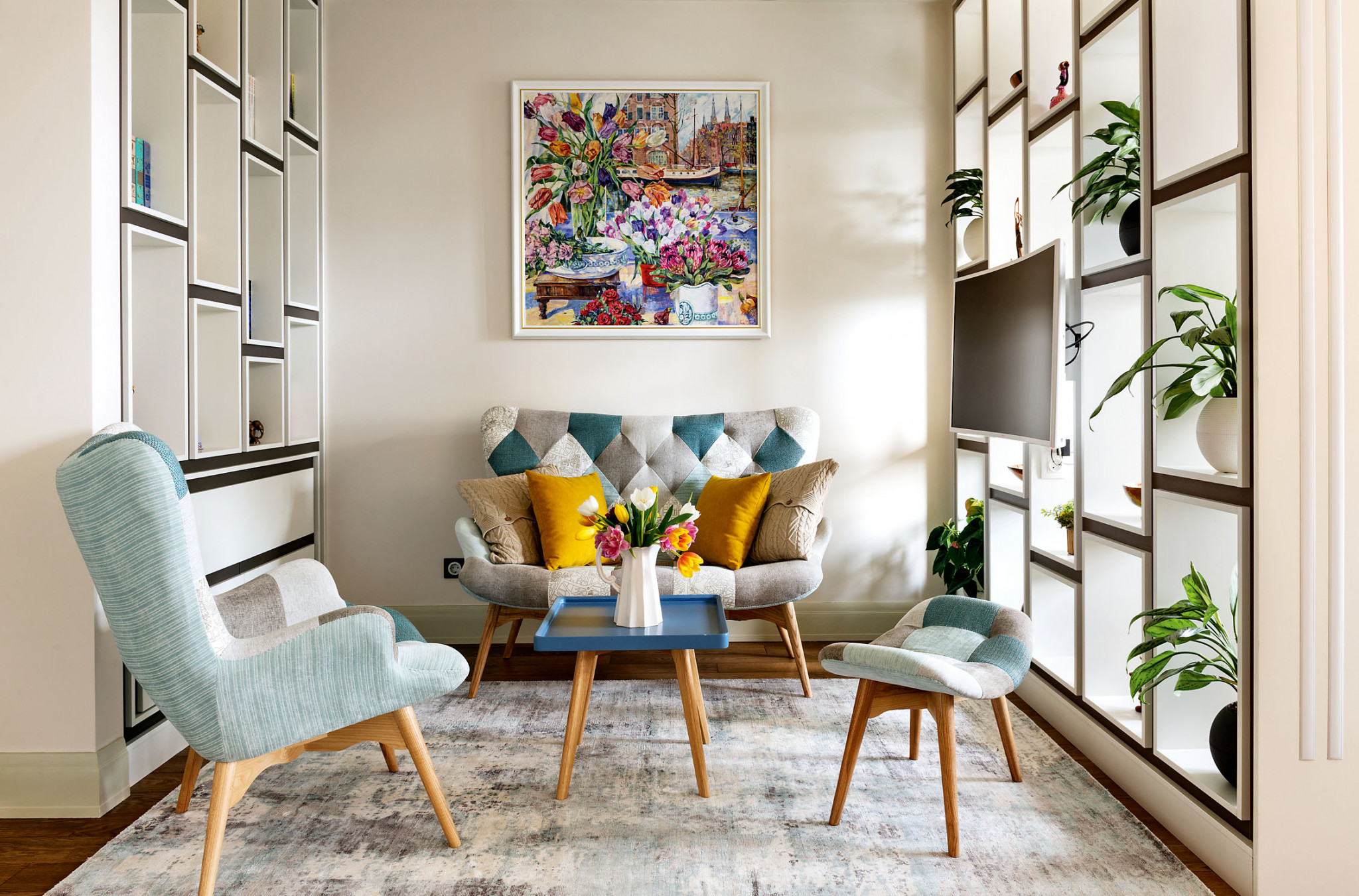 Перепланировка. Стартовые условия были довольно неудачными: и без того небольшая квартира отличалась крошечными спальней и кухней и при этом нелогично просторным холлом. Чтобы выполнить все пожелания и сделать жилище удобным для проживания владелицы, пришлось прибегнуть к демонтажу всех ненесущих межкомнатных перегородок. Кроме того, на имеющейся площади удалось спланировать две полноценные гардеробные с входом из транзитной зоны: меньшая, что при входе, предназначена для размещения верхней одежды и обуви, большая — для хранения остальных вещей и различных бытовых принадлежностей. Влажные помещения (ванную комнату и санузел) совместили, оставив на прежнем месте.