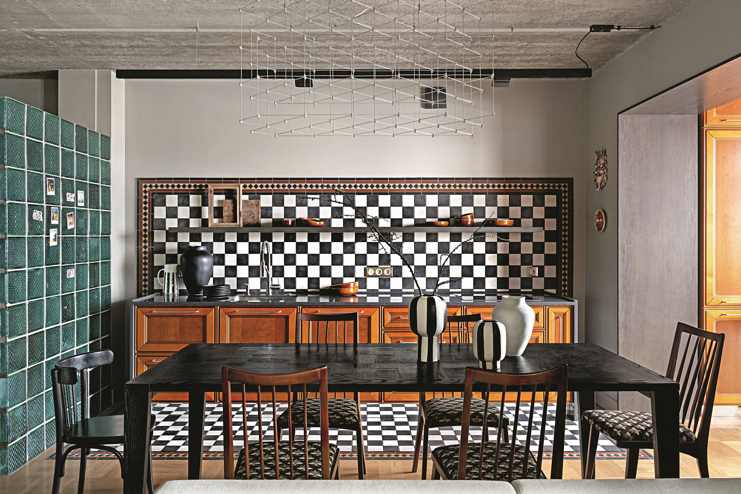 Перепланировка. Друзья часто заходят в гости, поэтому для посиделок предусмотрена большая столовая зона. На этапе перепланировки отдельную кухню и примыкающую к ней комнату объединили в свободное общественное пространство. Из функциональной кухни дизайнер сделала «картинку»: вместо привычного верхнего яруса шкафов и полок идёт выразительный геометрический орнамент, выложенный из керамической плитки. Встроенному холодильнику нашлось место по соседству, в утеплённой лоджии. Прихожая модернизирована естественным освещением за счёт широкого открытого проёма, ведущего в гостиную, и строительства новой перегородки из стеклоблоков.