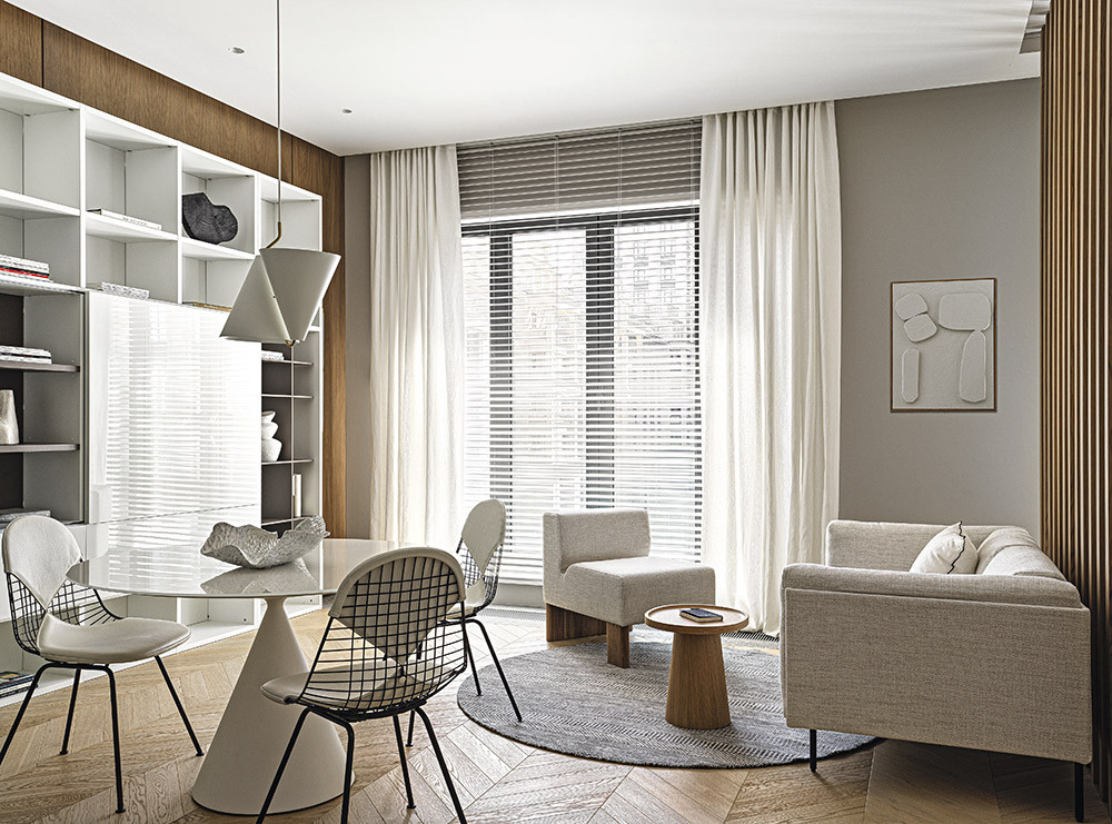 Интерьер квартиры в столичном малоэтажном ЖК «Оливковый дом» подкупает спокойствием и простотой. Ведущий стиль — мягкий минимализм. Нейтральные цвета, деликатные фактуры и качественные натуральные материалы создают приятную и тёплую атмосферу, а предметы мебели «высоких» дизайнерских брендов добавляют элегантности
