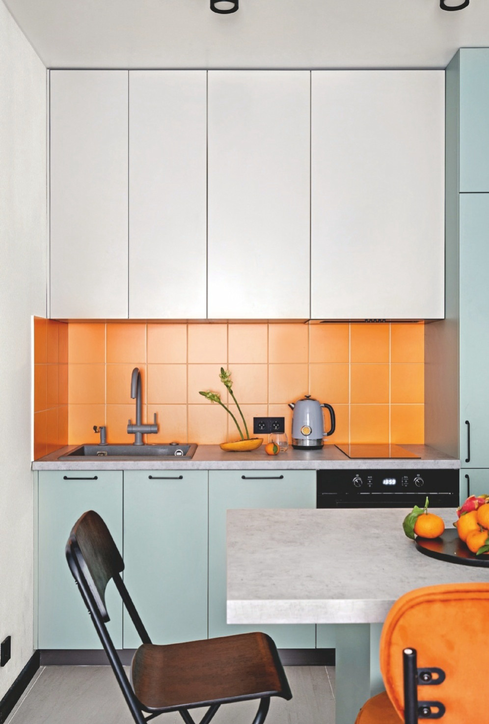 Наша студия создаёт интерьеры, где каждый квадратный метр отвечает потребностям заказчика. Большая удача проекта — работа с человеком, который прислушивается к советам. После проработки мест пользования и хранения кухонная зона стандартной планировки с ремонтом от застройщика стала функциональной, яркой и запоминающейся. Мы использовали классический приём: спокойный цвет стен, основной мебели, к которому добавили яркие, контрастные элементы. Акцентный фартук придаёт интерьеру экзотическую, смелую нотку. Её поддерживают декор и обивка стульев. Интересно, что уже после сдачи проекта заказчик, путешествуя по Марокко, с нашей помощью выбрал ковер тёплой оранжевой гаммы для интерьера гостиной и гармоничного сочетания с кухней.