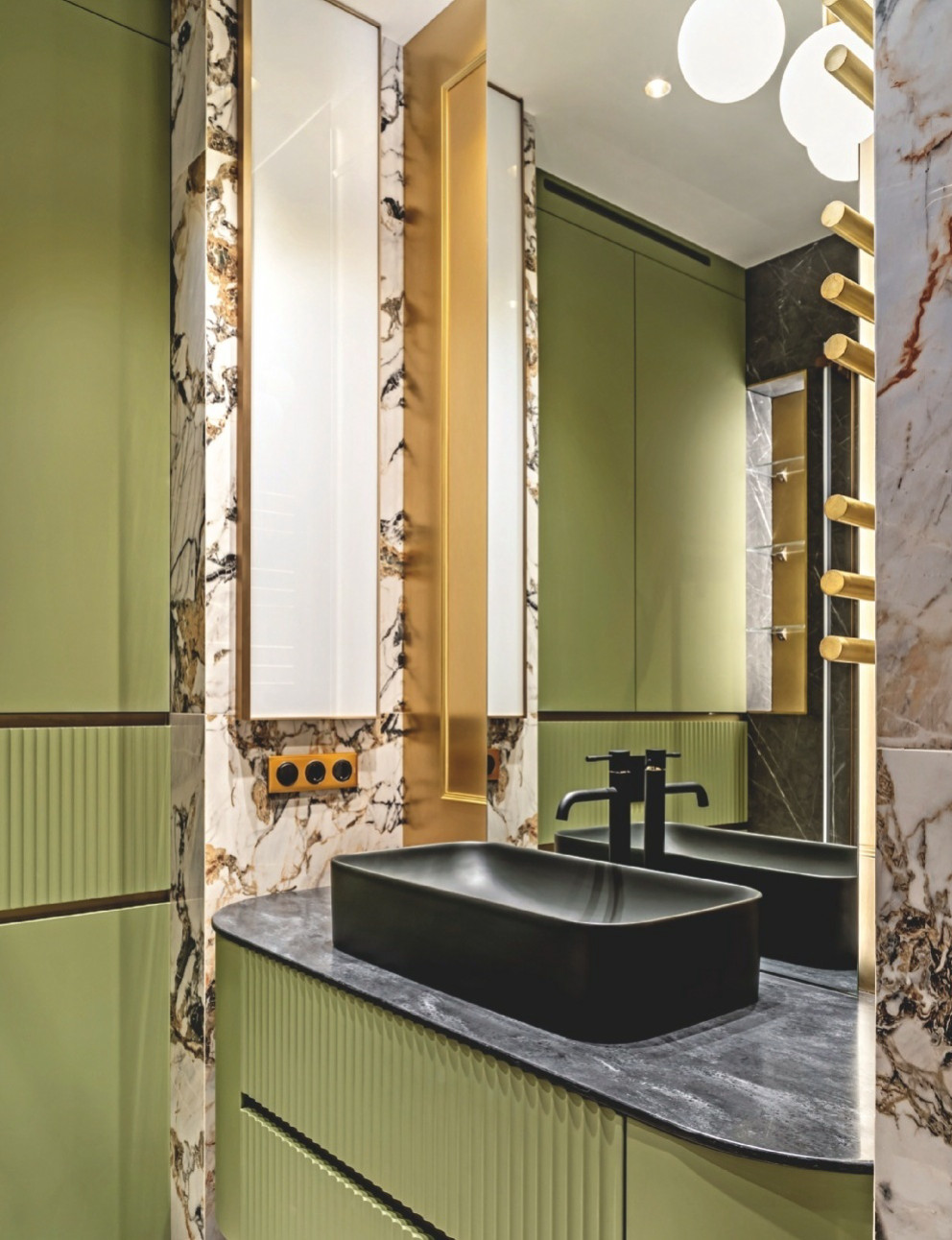 Пространство ванной комнаты разделено на функциональные зоны: душевая с тёмной плиткой под мрамор и стеклянной перегородкой, зона умывальника, унитаз, за которым встроили инсталляцию и системы хранения. Мебельные фасады с вертикальной фрезеровкой придают поверхностям ритм и необходимую тактильную фактурность.