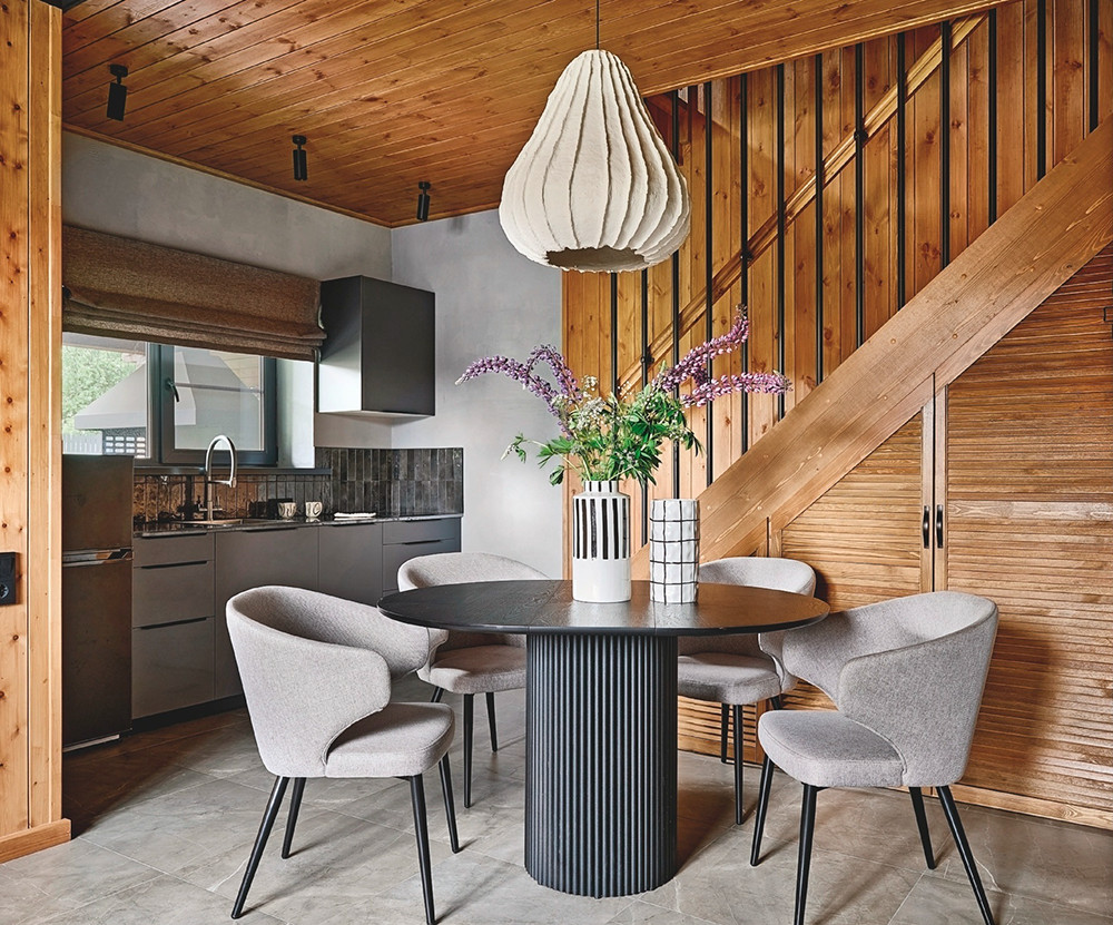 Несмотря на компактный метраж, банный дом должен был включать полный набор функций, сопоставимый с жилым пространством: прихожую, кухню, санузел, душевую и гостиную зону. Поскольку здание расположено отдельно, требовалось также предусмотреть собственную небольшую бойлерную. Изначально инженерное оборудование планировали разместить в санузле, однако от этого решения отказались: было важно сохранить визуальную чистоту интерьера. В результате оборудование перенесли под лестницу, организовав там компактную техническую зону, скрытую за жалюзийными дверцами. Помимо инженерных узлов, под лестницей предусмотрено место для хранения хозяйственных принадлежностей, что позволило рационально использовать каждый квадратный метр без перегрузки жилых зон.