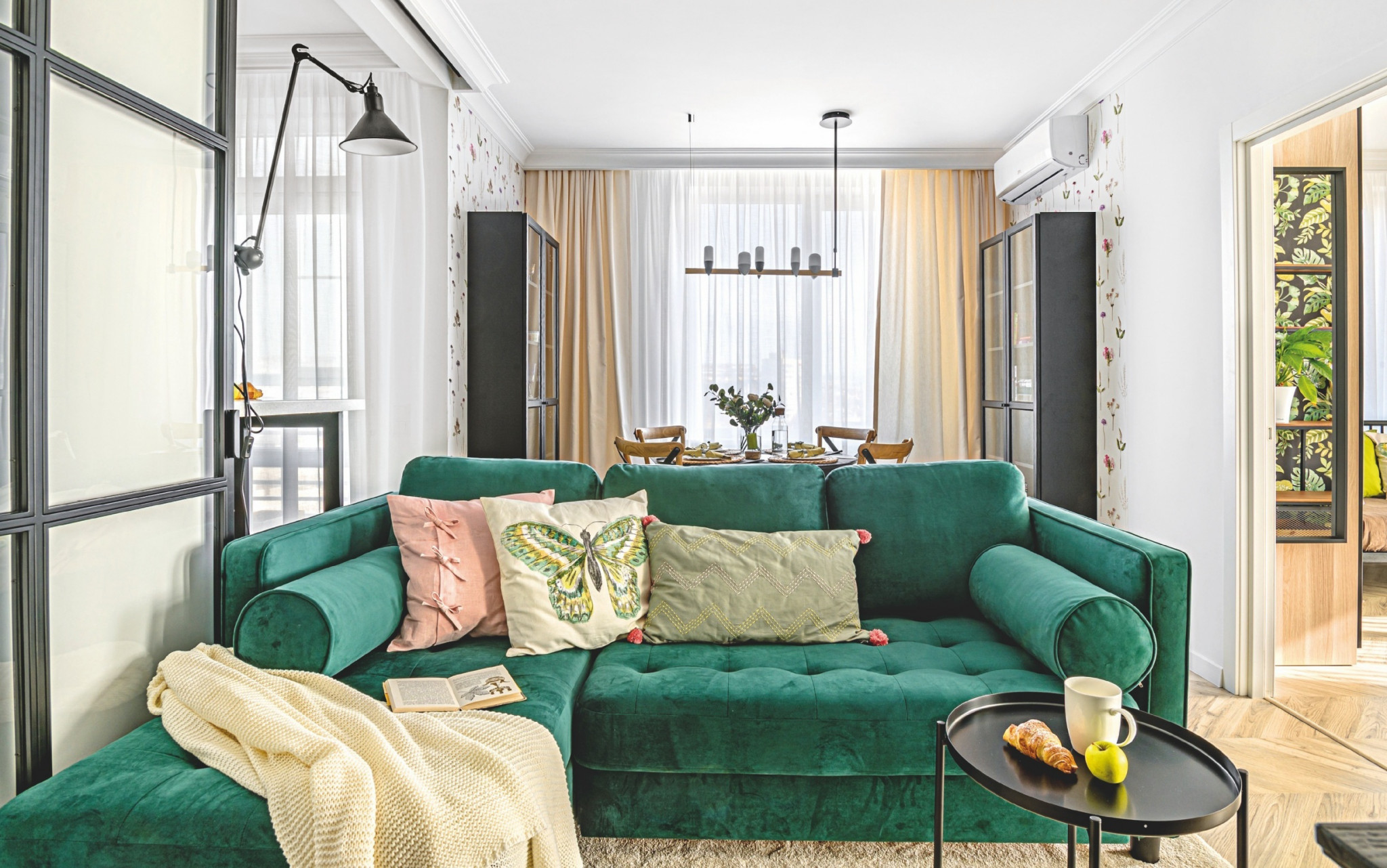 Всплески насыщенного изумрудного в отделке стен и мебели, растительные узоры на светлом и чёрном фоне — оригинальное оформление квартиры настраивает на позитив