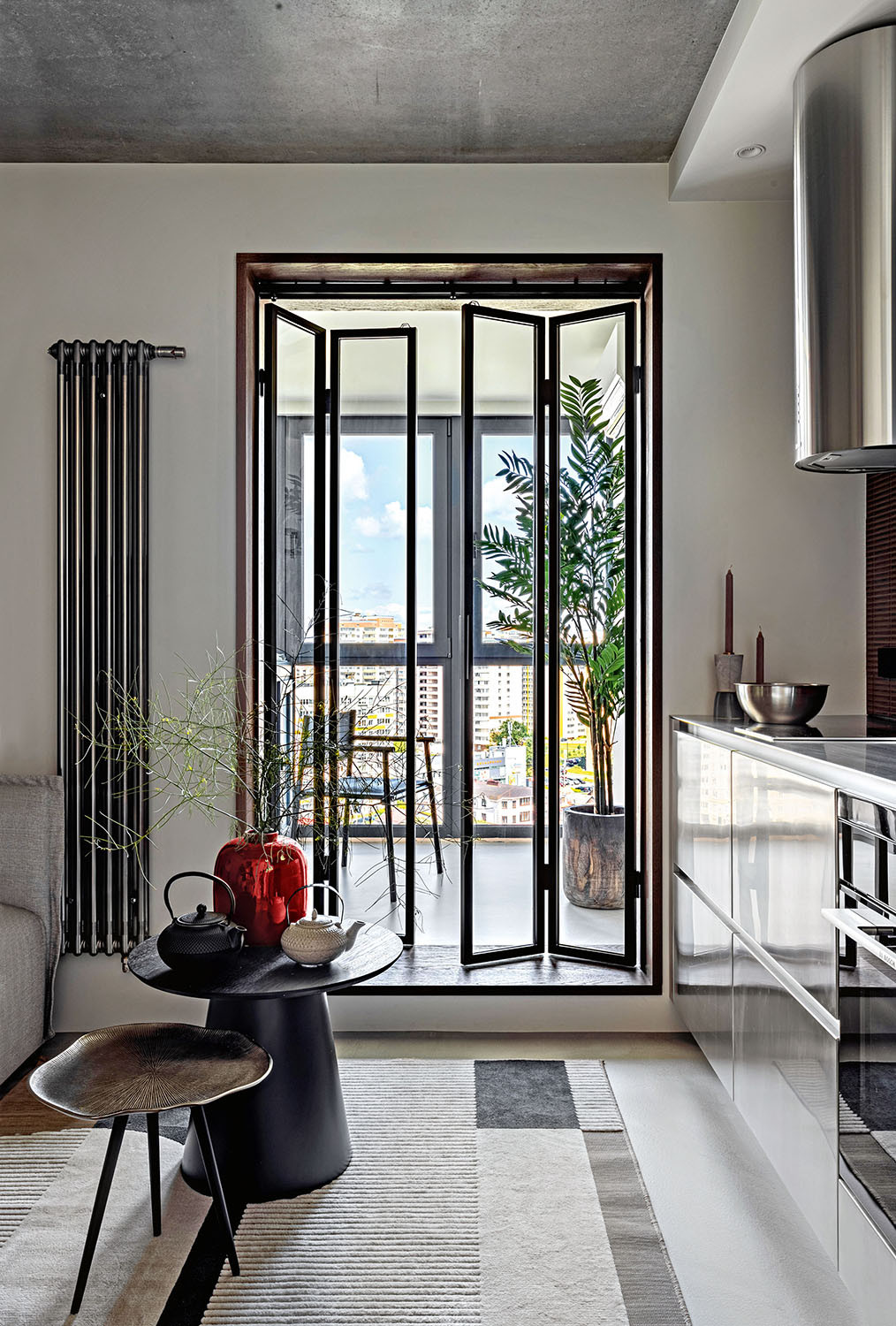 Высоту потолков (всего 2,6 м) удалось сохранить: потолочные перекрытия зачистили и отшлифовали неровности. Потолок опустили только в зоне гардеробной и над кухонным гарнитуром, а в получившемся пространстве между перекрытием и подвесным потолком из ГКЛ установили распределительные коробки, встроенное освещение, провели вентиляцию. Самым сложным в этом проекте было развести электрику по всей квартире, практически не заходя на потолки. Радиаторы от застройщика заменили на дизайнерские вертикальные. Утеплили лоджию, заменили окна на тёплые ПВХ-стеклопакеты.