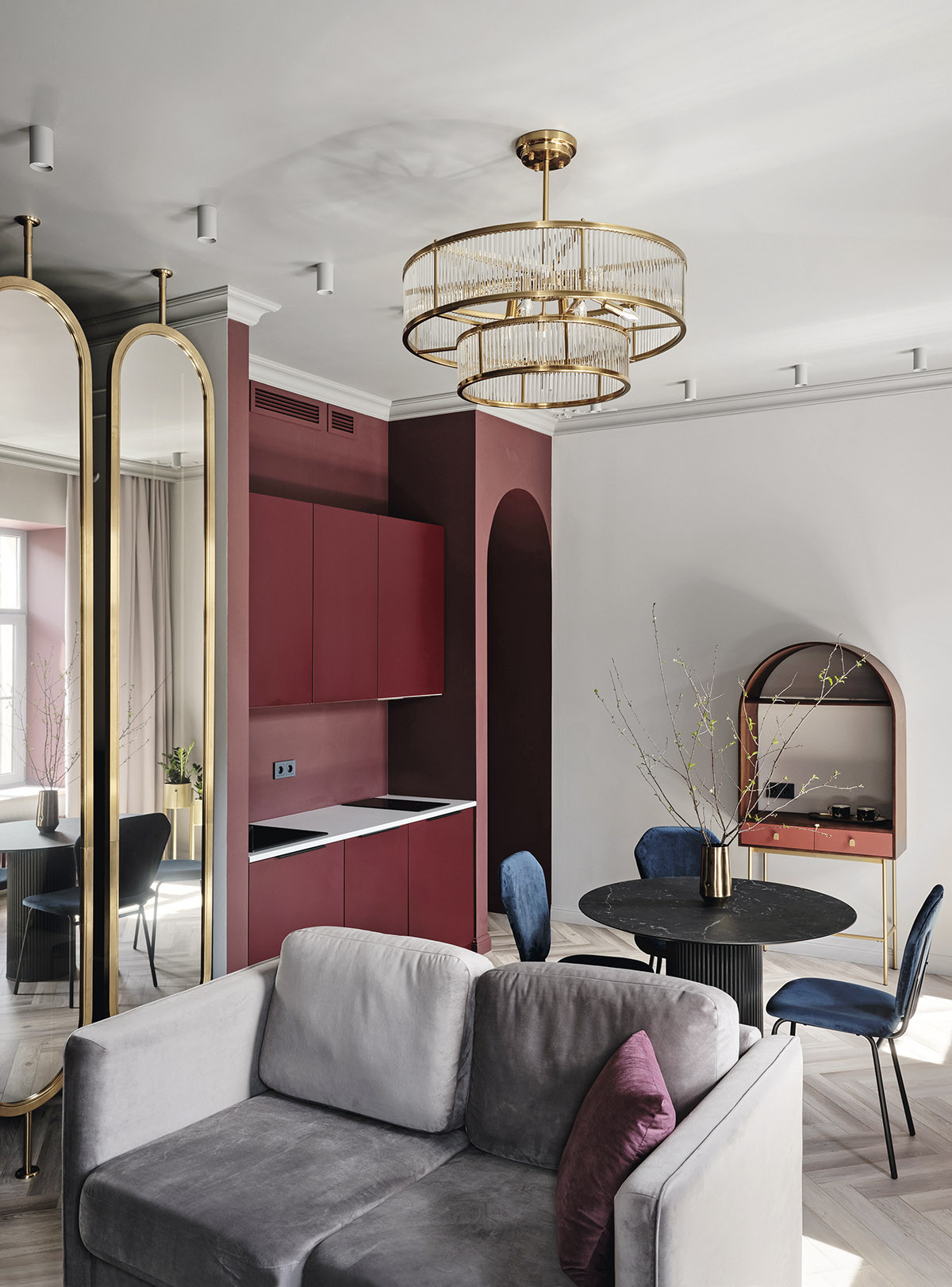 Интерьер привлекает изяществом и оригинальными решениями. Зеркальные элементы, арочные формы и изысканная мебель в совокупности с колористической палитрой создают впечатляющую атмосферу, соответствующую архитектуре и местоположению дома. Дизайнерам важно было вернуть квартире утраченный статус и разделить её при этом на две полноценные по функционалу части.