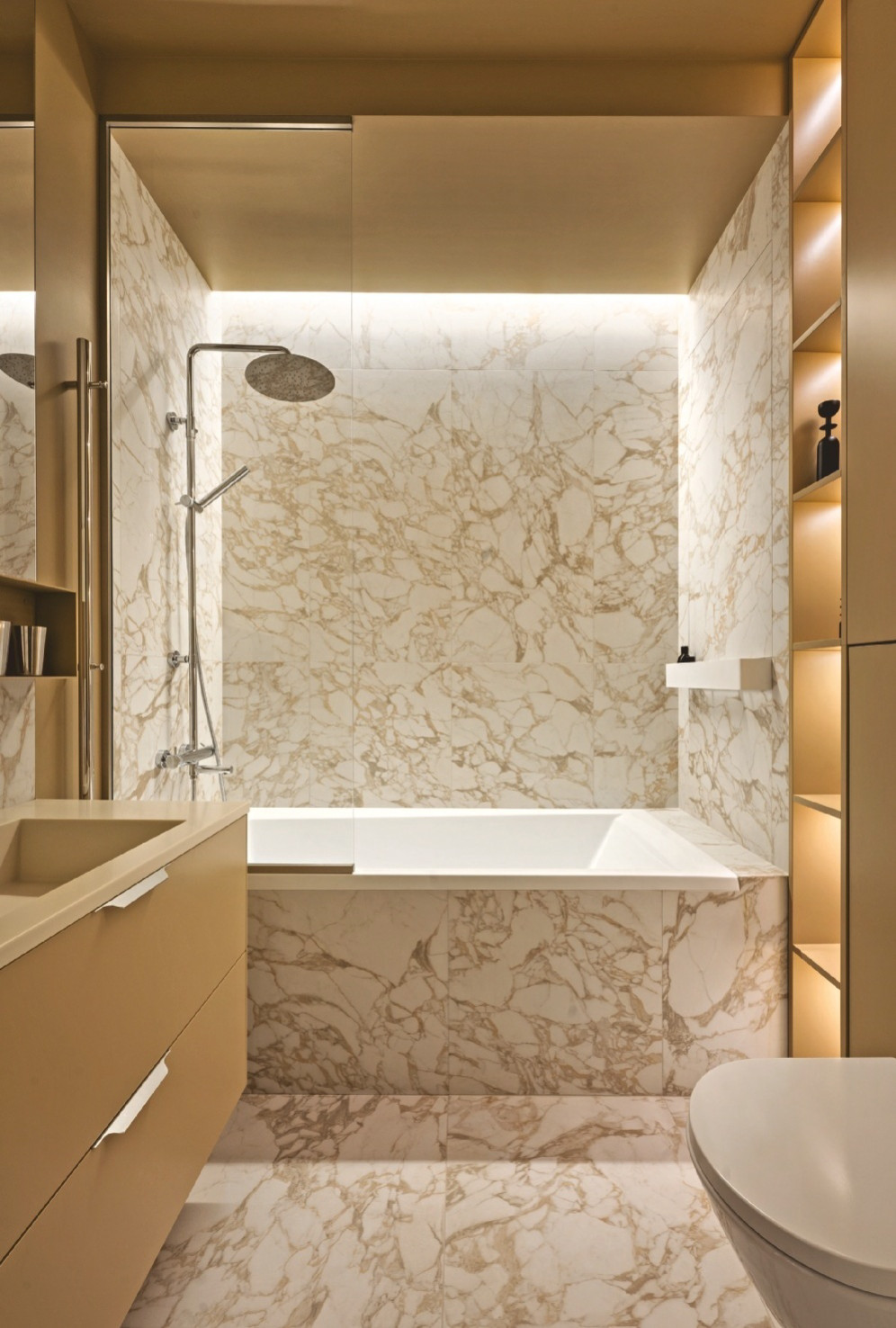 Функциональное зонирование санузла реализовано с помощью разных отделочных материалов. Экран под ванной и стены около неё облицованы керамической плиткой под камень. Уровень потолка здесь немного занижен и помогает визуально выделить место купания. Функцию скрытой подсветки выполняет влагозащищённая светодиодная лента в специальном профиле с дополнительной защитой от брызг. Такое решение безопасно, так как элементы освещения имеют необходимую степень защиты от прямого контакта с водой. Стены вне зоны ванной окрашены влагостойкой краской. Им в тон подобран цвет мебели — для лёгкости и воздушности. Основа дизайна — карамельная цветовая гамма, а разные сценарии освещения, в том числе подсветка полочек и места купания, добавляют интерьеру глубины и теплоты.