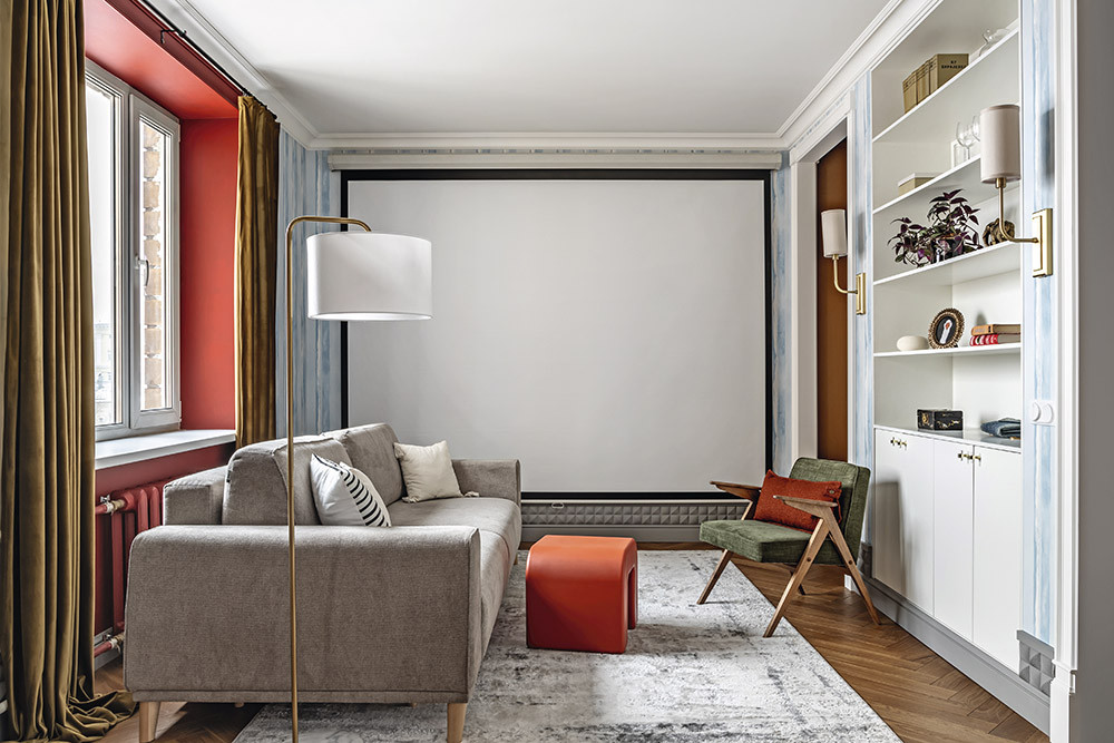 Квартира расположена в сталинке в московском районе Хамовники. Дворик с деревьями и цветами, интеллигентные соседи и потрясающие виды из окон: на МИД с одной стороны и на реку и вечерний город — с другой. И хотя это инвестиционный проект — квартира предназначалась для последующей продажи, — у неё есть свой образ и душа, соответствующие месторасположению.