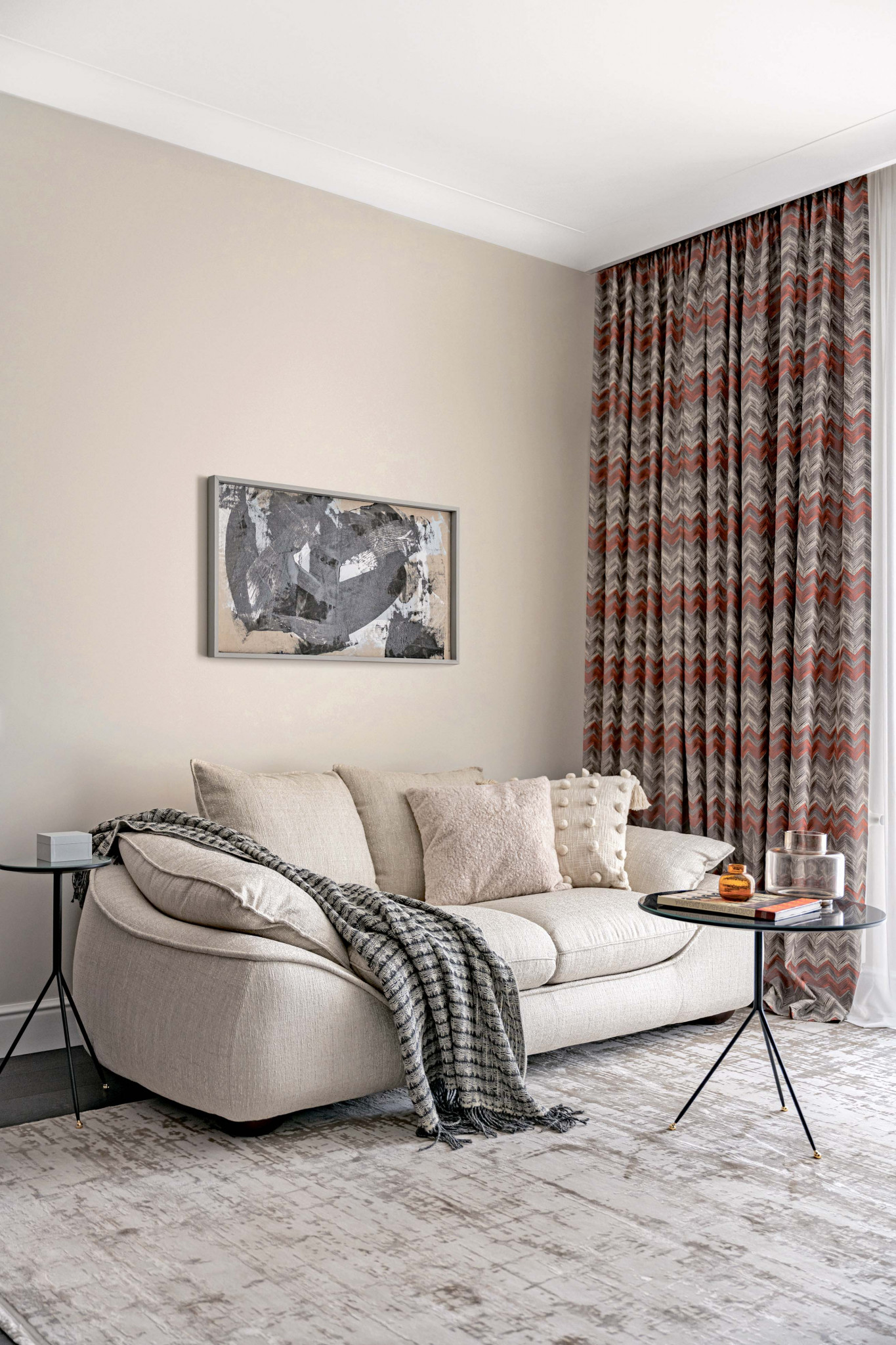 Хозяйка квартиры — бизнес-леди, еженедельно бывает в Челябинске по делам, а потому решила приобрести квартиру в этом городе. Выбор пал на ЖК «Лесопарковый» вблизи городского бора с живописными видами из окон и собственной подземной парковкой. Перед дизайнером была поставлена задача создать домашнюю, умиротворяющую атмосферу в спокойной цветовой гамме и с использованием только качественных материалов, а ещё полностью проконтролировать процессы строительства и ремонта. Заказчица привыкла к комфорту в быту и попросила сделать звукоизоляцию, поставить систему очистки воды и водонагреватель на случай сезонных отключений. В обстановке ей нужны были высокие дверные проёмы для ощущения «простора и воздуха» и обязательно стол с высокими барными стульями, чтобы можно было посидеть с подругами. Также ей хотелось привнести в интерьер что-то не слишком функциональное, а скорее атмосферное. Так в гостиной появился электрокамин.
