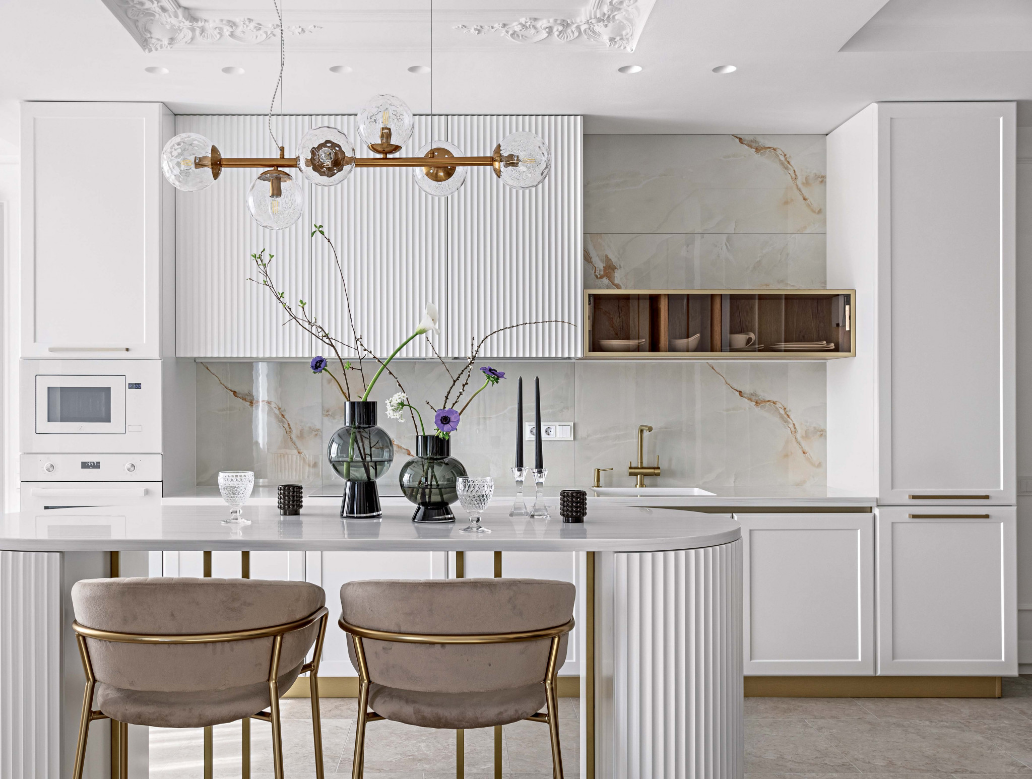 Пребывание в дорогом отеле сулит комфорт и свободу от бытовых забот, хорошее настроение и ощущение собственной значимости. Аналогичную атмосферу создали в квартире, которая используется владельцами в качестве дополнительного жилья. Проект воплотили, применив современные отделочные материалы, имитирующие благородные металлы и минералы, витиеватую лепнину. Интерьер получился воздушным и роскошным, причём удалось вписать даже кухонный гарнитур. За счёт общности декора: выразительного рисунка мрамора, рельефа панелей, тонированного стекла и отделки золотом — рабочая часть кухни растворяется в основном пространстве.