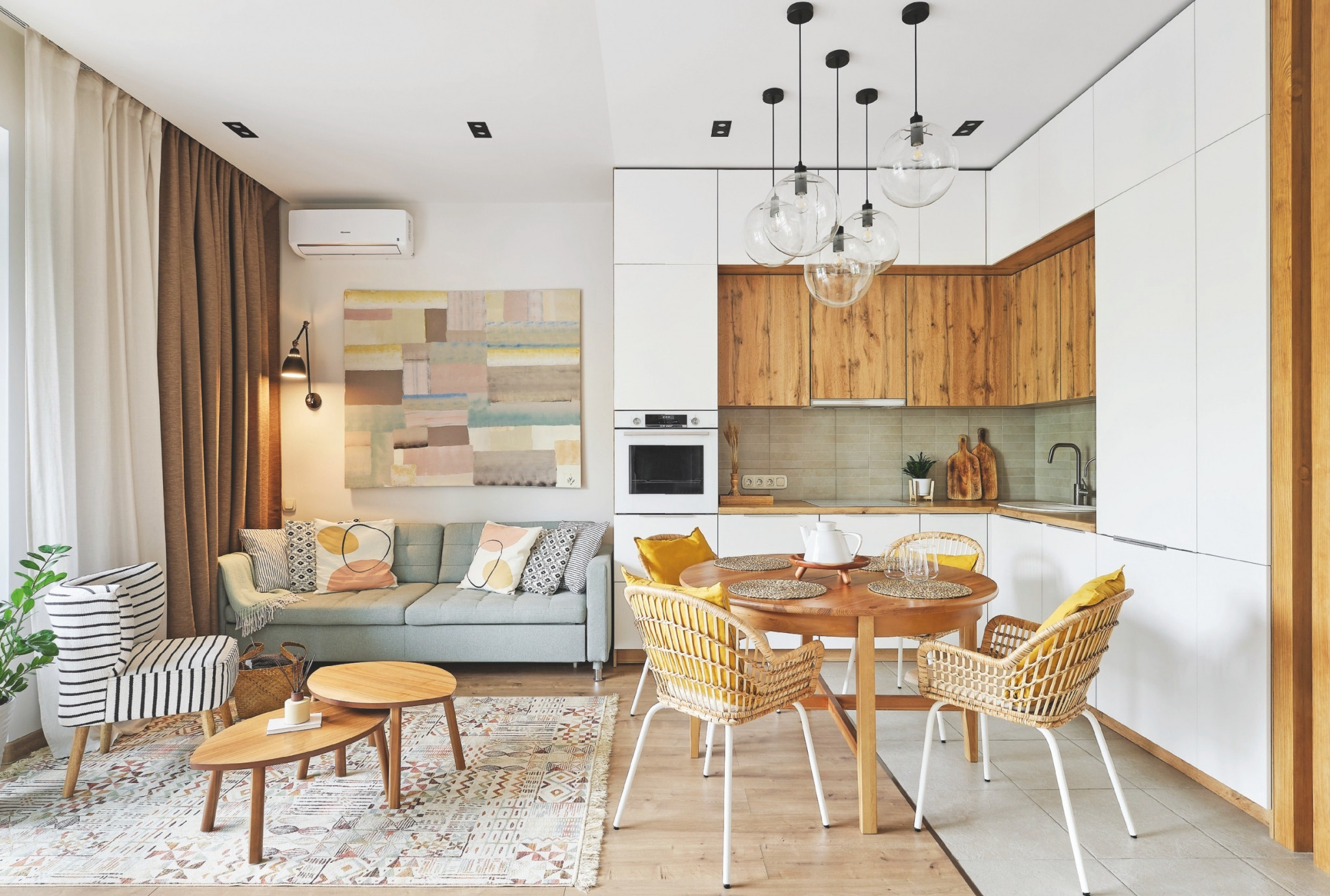 В квартире с открытой планировкой репрезентативной зоны и несколькими изолированными комнатами становится теплее и комфортнее за счёт природной цветовой гаммы, предметов из натурального дерева и текстильных аксессуаров