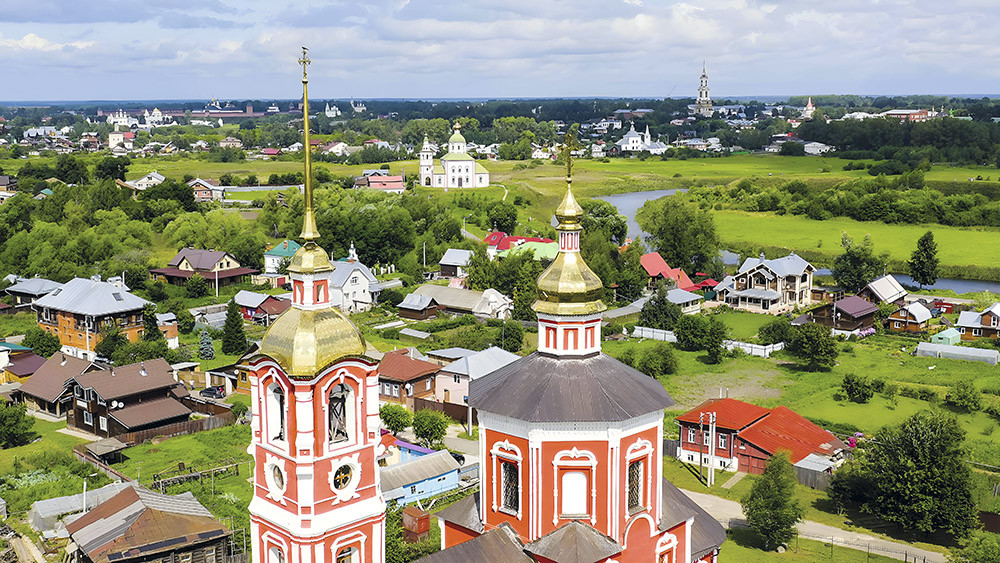 Дорога к Суздальскому кремлю проходит мимо знаковой достопримечательности – Торговых рядов. Здание в виде длинной галереи с арками и колоннами было построено в начале XIX века, когда-то тут располагались купеческие лавки, а теперь – магазины и палатки с сувенирами. А еще здесь можно почувствовать себя героем фильма «Женитьба Бальзаминова» или сериала «Братья Карамазовы», попасть в декорации «Андрея Рублева» Тарковского или картины Лунгина «Царь». Суздаль – один из самых кинематографических российских городов, количество снятых на его территории фильмов – более 50. И это неудивительно. Здесь время будто замерло. Все здания высотой 2–3 этажа – красиво оформленные, с окнами в резных наличниках. Нет не то что высоток – даже сталинок. Просматривается лишь один район, где строятся новые коттеджи, но и они полностью вписываются в общий антураж. А с учетом того, что кругом продаются кокошники, сарафаны, медовуха течет рекой, а у домов – вода из колонок, ты будто правда оказываешься в далеком прошлом.