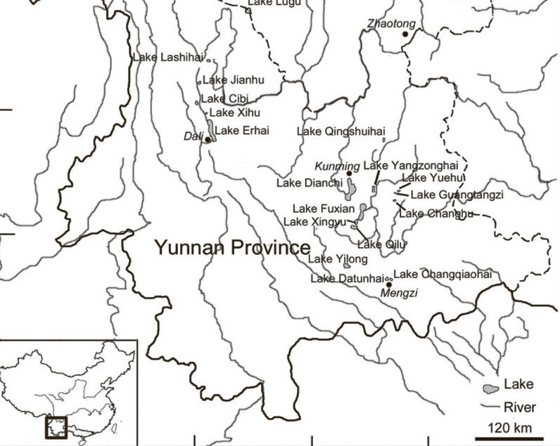 13 озер провинции Юньнань были затронуты местным вымиранием. В основном мы имеем дело с небольшими озерами, которые образовались в горах.