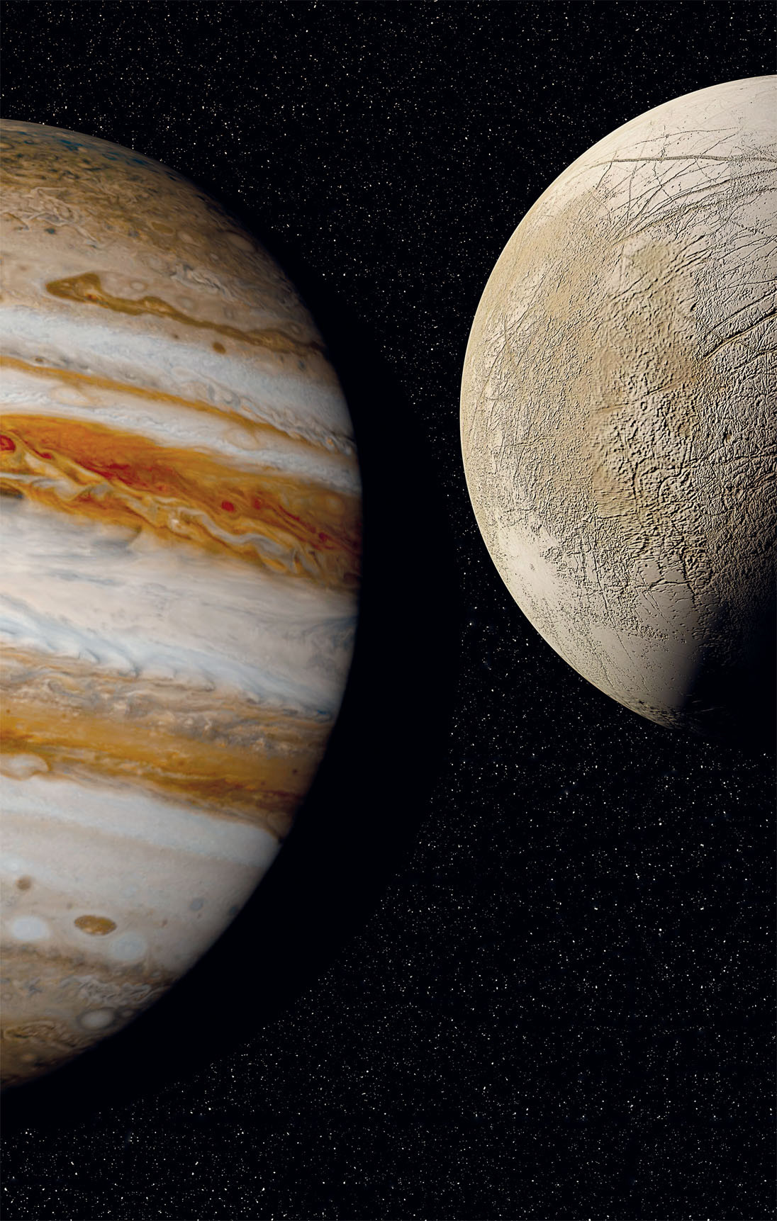 За снеговой линией Солнечной системы – далее четырех астрономических единиц – температура протопланетного диска 4,5 млрд лет назад была достаточно низкой, чтобы вода (самое распространенное химическое соединение во Вселенной) присутствовала в нем не в форме пара, а в форме снега, и на общих основаниях с минеральной пылью участвовала в формировании лун и планет. Но молодой Юпитер на этапе быстрого сжатия был так горяч, что сломал систему. В его окрестностях образовалась собственная снеговая линия. В результате внутренний спутник – Ио – родился как тело «землеподобное», каменное целиком. Два внешних – Ганимед и Каллисто – оказались «водяными». Европа же формировалась в обломочном кольце, радиус которого с радиусом снеговой линии примерно совпадал. И получилось, как получилось.