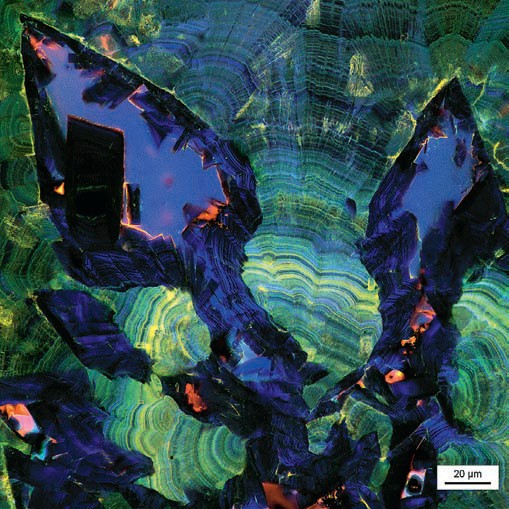Геологи и биологи из университета Иллинойса (США) взялись за изучение почечных камней. Новое исследование показало, что камни в почках постоянно растворяются и снова нарастают. Возможно, медикам удастся ускорить процессы растворения, чтобы пациенты обходились без операции. На снимке — тонкий шлиф почечного камня под микроскопом при освещении ультрафиолетовым светом. Разные минералы (преобладают соли щавелевой и фосфорной кислот) флуоресцируют разным цветом.