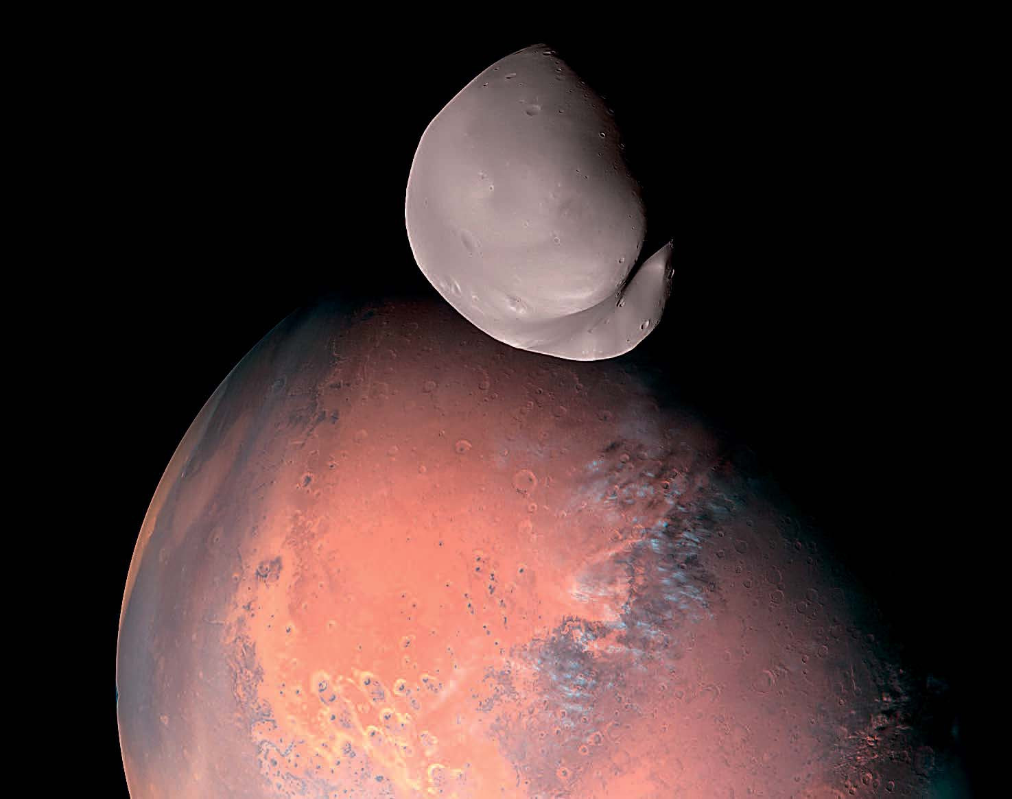 Космический зонд «Hope», запущенный Объединёнными Арабскими Эмиратами в июле 2020 года с японского космо-дрома и вышедший на орбиту вокруг Красной планеты в марте 2021-го, сделал снимки меньшего из двух спутников Марса — Деймоса. Судя по снимкам высокого разрешения и спектральным характеристикам Деймоса, это не захваченный Марсом астероид, как предполагали некоторые астрономы. Он состоит из того же материала типа базальта, что и сам Марс.