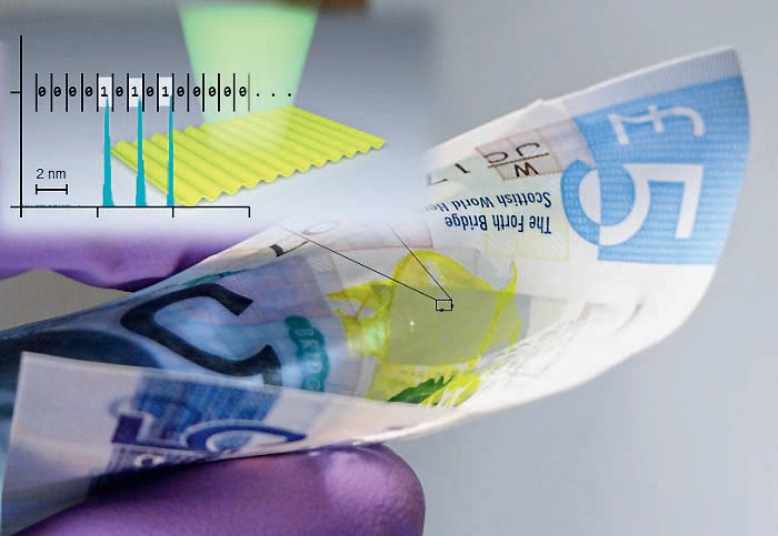 Инженеры из Сент-Эндрюсского университета (Шотландия) изготовили лазер, представляющий собой тончайшую плёночку из особого полимера. Предлагают наклеивать такой лазер, испускающий при возбуждении извне свет определённой длины волны, на банкноты или документы, что исключит возможность их подделки. Наклеив лазерную плёнку на ноготь руки, можно использовать её как пропуск или проездной билет — достаточно будет взмахнуть рукой перед соответствующим сенсором. Мощность микролазера — всего одна миллиардная ватта, но датчики хорошо замечают его свет.