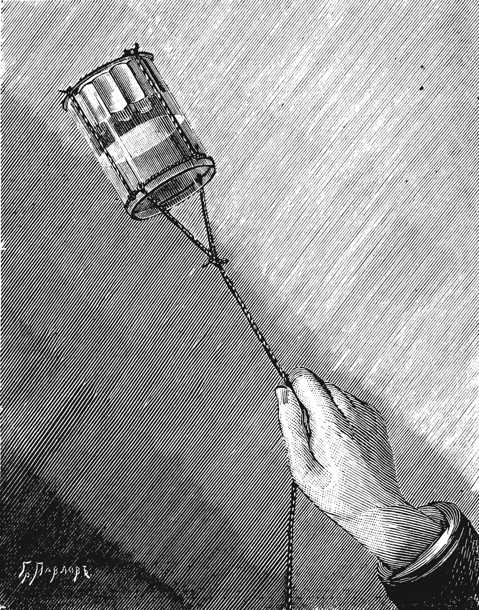 Возьмите обыкновенный чайный стакан и обвяжите его тонкою веревкой, как показано на гравюре; если есть под руками подстаканник, то можно поставить в него стакан и прикрепить веревку к подстаканнику. Затем наливаем стакан водой, берем в руку конец веревки и начинаем раскачивать; достаточно раскачав стакан, быстрым усилием станем вращать его вокруг руки. Стакан будет подниматься и опускаться по круговой линии; во время подъема стакан будет вверх дном, — и тем не менее из него не прольется ни капли воды.