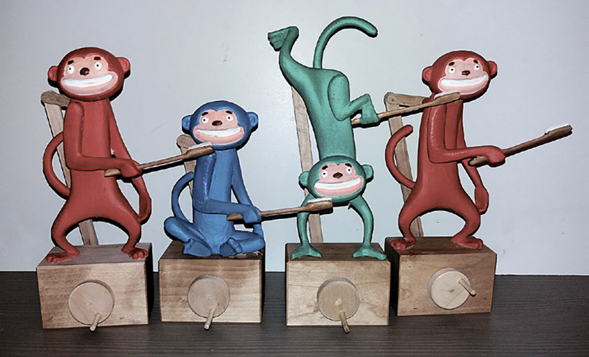 Обезьянки, в отличие от всего остального, там представленного, были всего лишь нарисованы. И я решил, что хорошо бы, чтобы какие-то механические игрушечные обезьянки реально чистили друг другу свои игрушечные зубки по такой же схеме. Обратился к Юрию Иванову из Чистополя, автору деревянных миниатюрных художественных скульптур, который делает и механические куклы. Он счёл задачу интересной, придумал художественное и техническое решение и изготовил эти игрушки. Получилось, по-моему, красиво (см. фото).