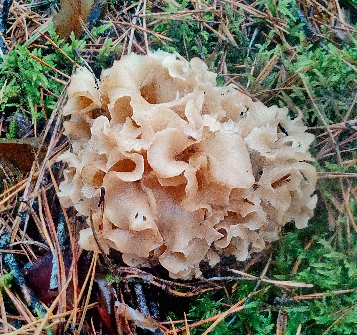 На фото — гриб, похожий по форме на листовой салат, съедобный, мы сразу жарим его. При жарке источает сильный грибной запах. Слышал такие названия — «баранья голова» и «гарах». Встречается довольно редко, за один поход в лес пока не удавалось найти более одного такого «кустика». Хочется узнать о нём побольше. Фото сделано недалеко от Беловежской пущи, возле агрогородка Каменюки (Брестская область, Беларусь). Этот экземпляр белый, но ранее встречались пожелтевшие.