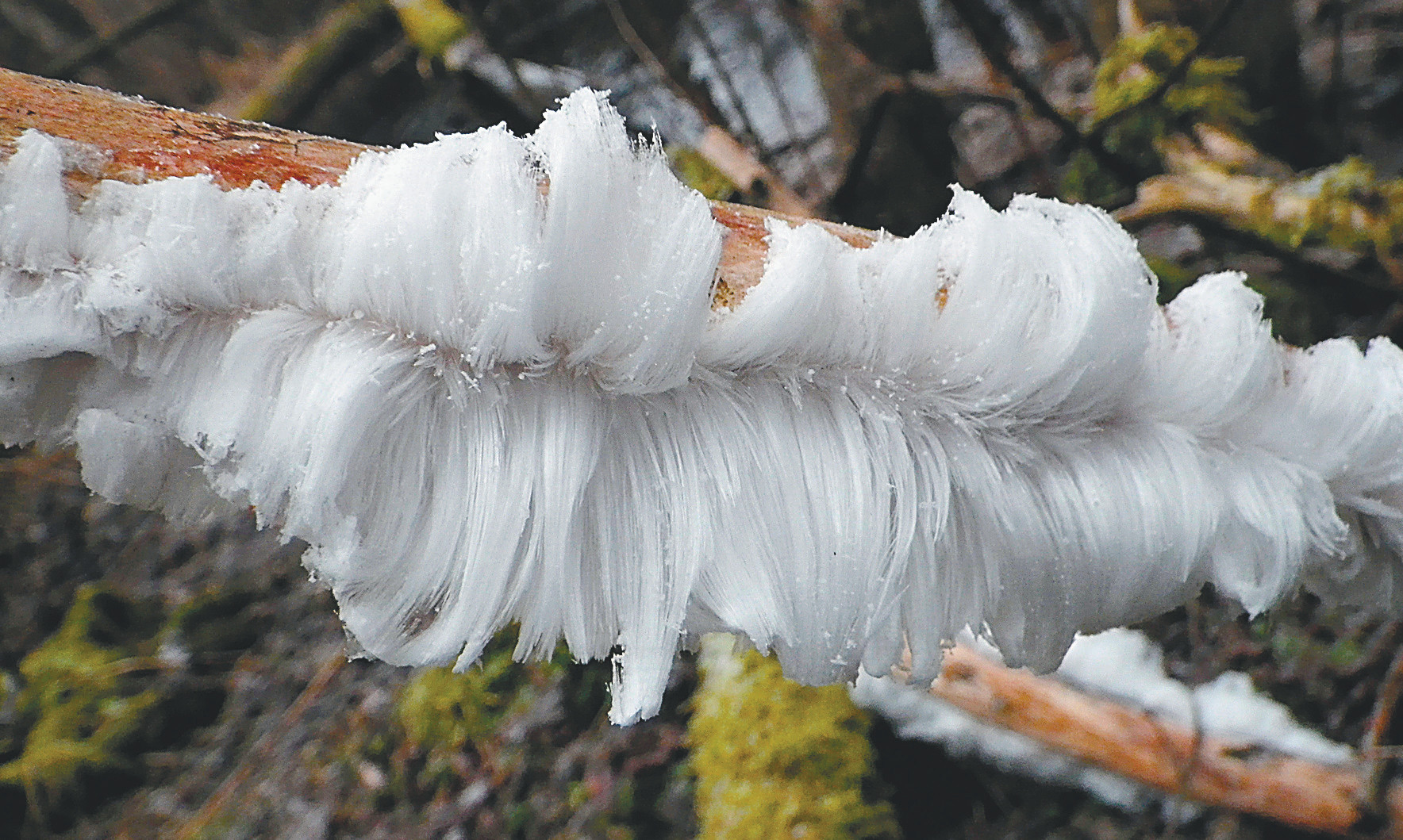 И всё же я начну своё повествование не с них, а с довольно невзрачного, распростёртого по субстрату трутовика, который создаёт в лесу ощущение зимы ещё до первого снегопада. Речь идет об эксидиопсисе налитом (Exidiopsis effusa). Его причастность к возникновению легендарных «снежных волос» доказана в 2015 году группой немецких и швейцарских учёных. На разгадку их тайны ушёл почти целый век, ведь впервые феномен «ледяных волос» описал в 1918 году немецкий учёный Альфред Вегенер — создатель теории дрейфа материков.