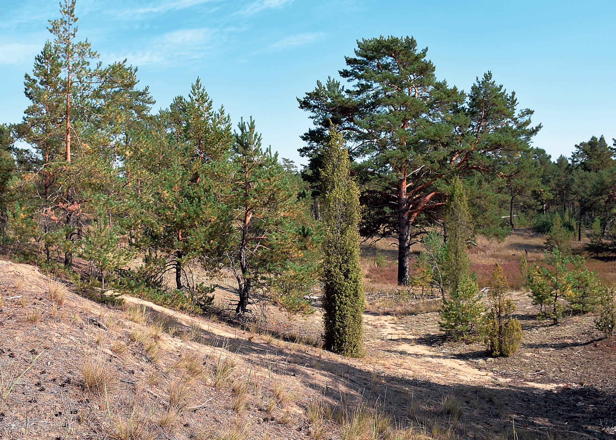 В спокойных пейзажах средней полосы России есть совершенно особые уголки. Там даже местные уроженцы чувствуют себя посторонними — настолько «иноземным» выглядит всё окружающее, включая обитателей растительного мира. Пример таких уголков — сосновые боры на мощных песках, которые под воздействием ветров образуют дюны. Песчаная толща до нескольких десятков метров имеет здесь чаще всего зандровое происхождение, то есть она образовалась в результате оттока мелких частиц при таянии четвертичных покровных ледников. А поскольку ложбинами стока для таких водно-песчаных потоков служили долины рек, то и распространены эти «боры на дюнах», как мы их называем, вблизи крупных речных долин. В Калужской области они встречаются в придолинных пространствах рек Ока, Жиздра, Угра.
