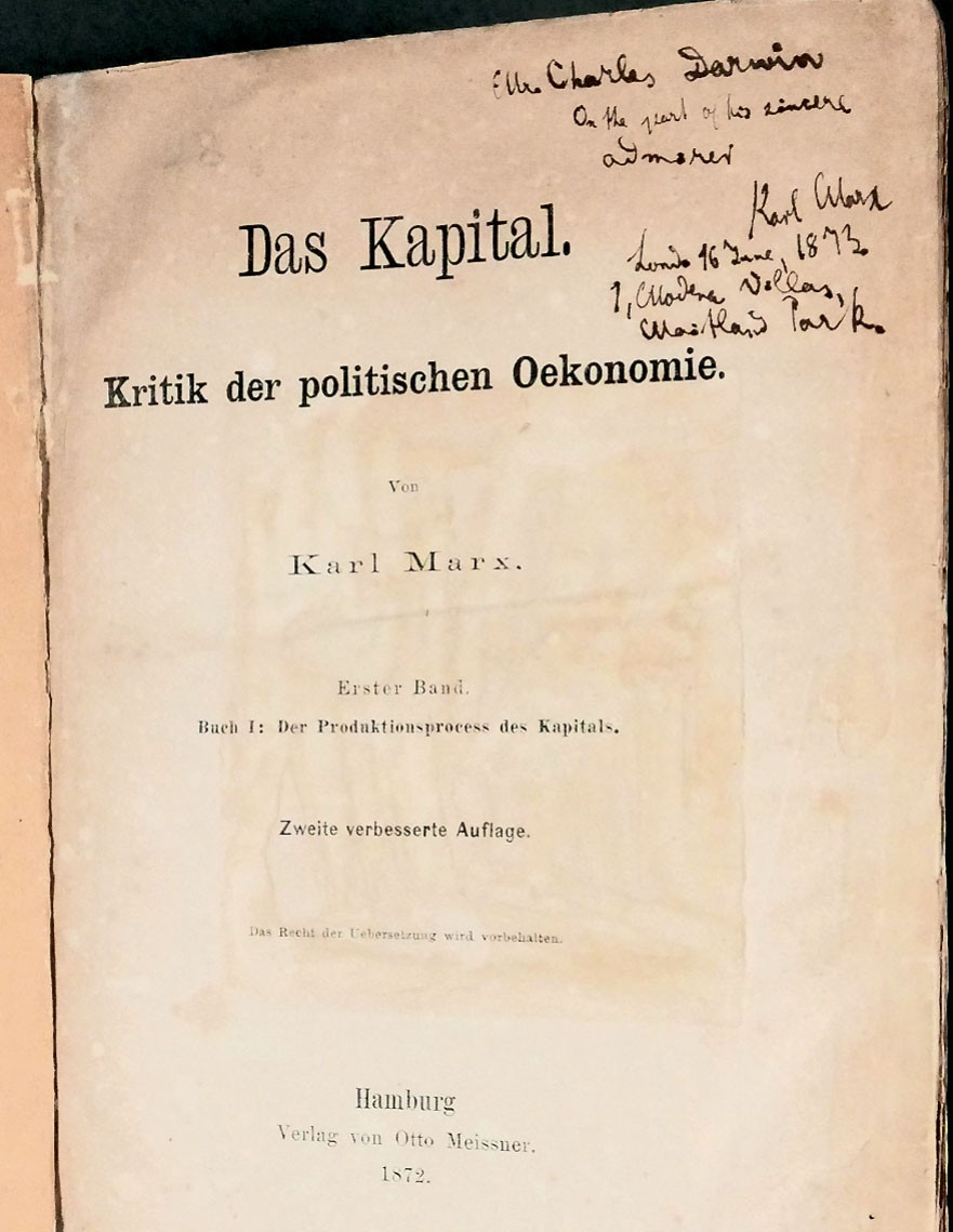 Большая библиотека из 13 000 томов, принадлежавшая Чарльзу Дарвину, до сих пор остаётся не полностью изученной. Многие книги после смерти учёного разошлись по другим владельцам, к тому же исследователей биографии и творчества Дарвина прежде всего интересуют книги по биологии, естествознанию и прочим близким ему темам. Наконец руки библиографов дошли до толстой книги, в которой Дарвин прочитал или хотя бы просмотрел только первые несколько страниц. Это первый том труда Карла Маркса «Капитал».