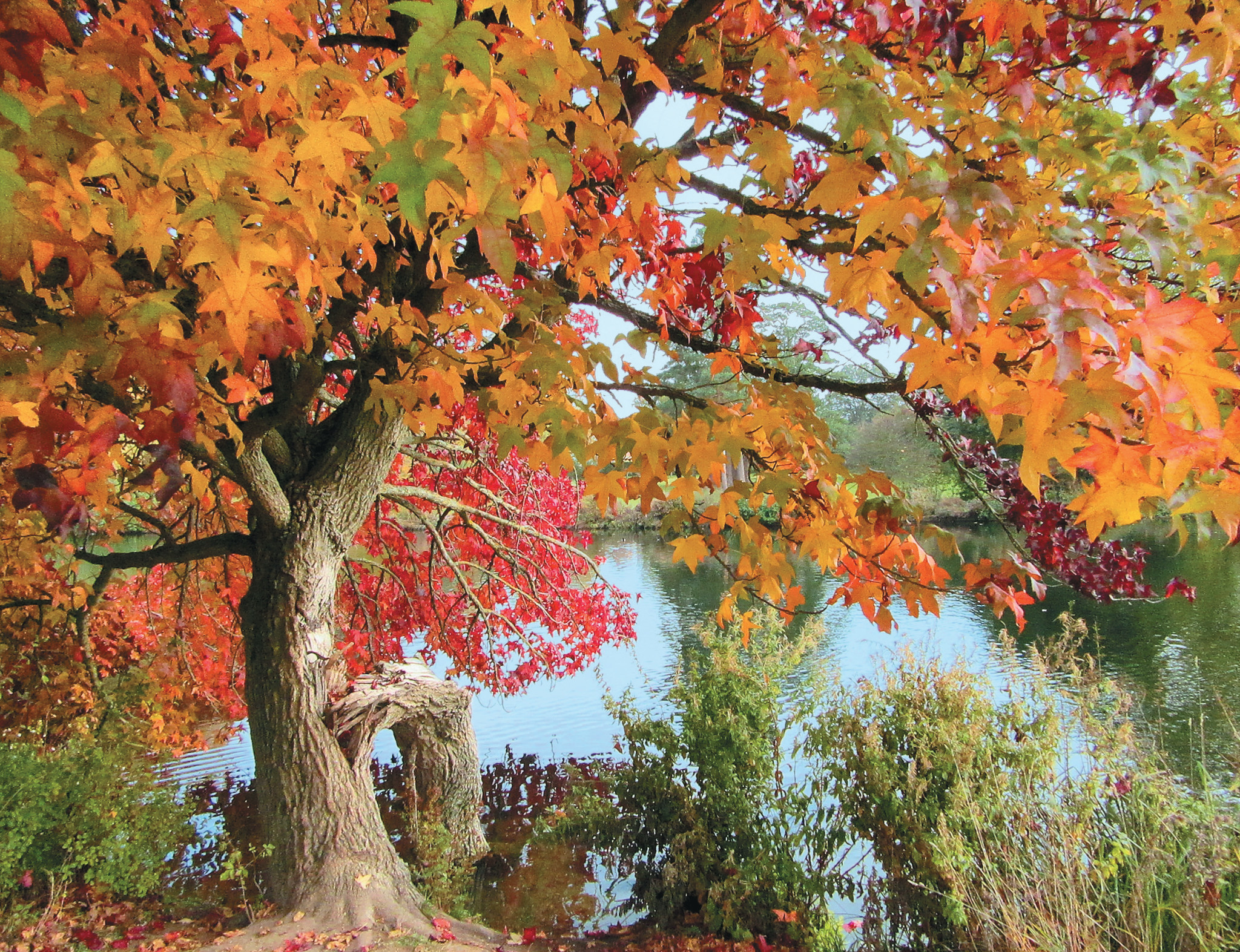 На берегу усадебного пруда росло живописное дерево, пышно одетое сверкающей на солнце ярко-огненной и малиновой листвой.