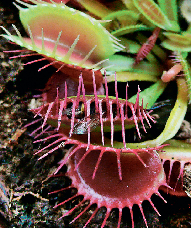 Хищное растение венерина мухоловка (Dionaea muscipula) растёт в североамериканских болотах, она близкий родственник нашей росянки (Drosera spp.). Растения эти стали хищниками не просто так, а из-за азотного дефицита, который и восполняют за счёт своих жертв. Как известно, болотистые почвы бедны азотом, и местной флоре приходится как-то адаптироваться к его нехватке. Однако поймать шуструю муху — совсем непростая задача для того, кто не летает, не бегает и не прыгает. Венерина мухоловка ловит добычу в капкан, образованный сложенной вдвое листовой пластинкой. Как только какая-нибудь букашка садится на коварный листочек, его створки мгновенно смыкаются, погребая жертву внутри. Затем в полость ловушки поступают пищеварительные ферменты, растворяющие все ткани насекомого, кроме хитинового покрова, и растению остаётся только всосать питательный бульон. На весь процесс уходит ни много ни мало десять дней.