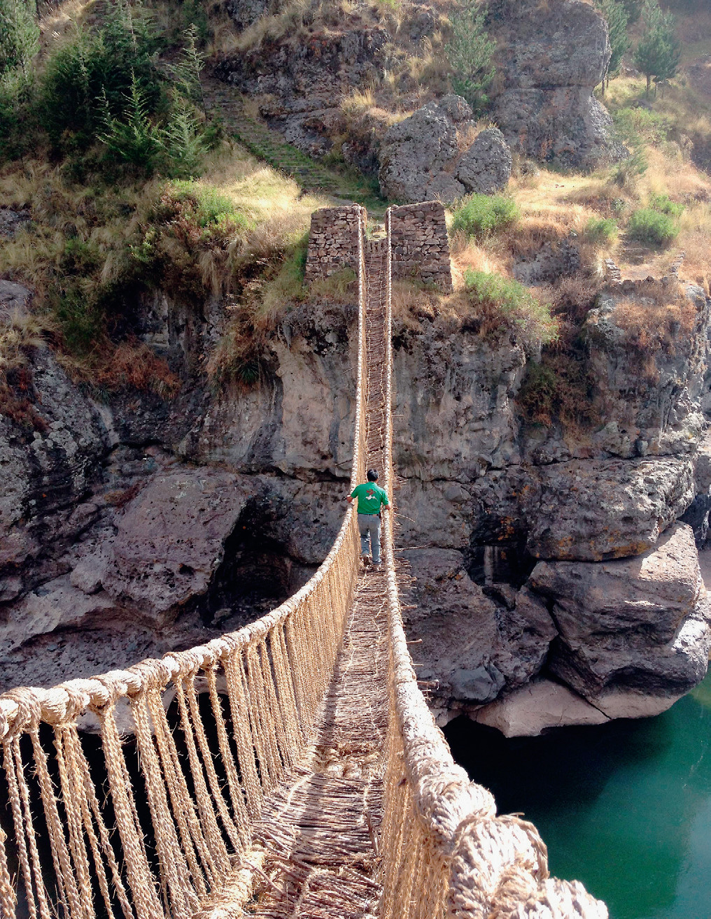 Через многие ущелья и реки Перу перекинуты мосты, сплетённые из травы. По некоторым оценкам, до прибытия европейцев в Андах было до 200 таких мостов, но к нашему времени сохранился всего один, через реку Апуримак. Он объявлен национальным историческим памятником и, как много веков назад, его приходится ежегодно обновлять. Для этого из окрестных деревень, пользующихся мостом, каждая семья приносит тюки травы, родственной нашему ковылю. Мастера плетут из травы, стебли которой достигают в длину двух метров, толстые тросы и более тонкие верёвки, и всё вместе соединяется в мост, точно такой, каким он был 300—500 лет назад. Операция обновления проходит как народный праздник.