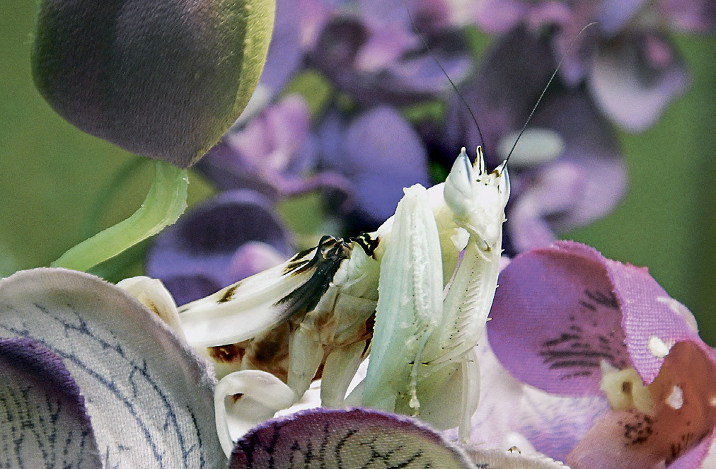 Мастер маскировки — орхидейный богомол, живущий в лесах Индии, Индонезии, Малайзии, Вьетнама и Таиланда, изображает причудливый цветок орхидеи и ловит насекомых, подлетающих полакомиться нектаром. Длина тела самки (на снимке) — 8 см, самцы вдвое мельче.