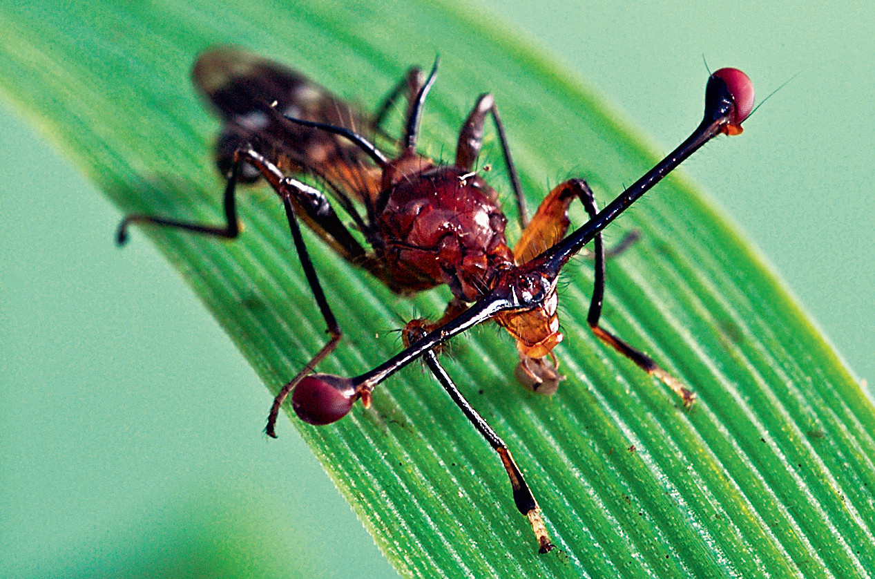Энтомологам известно около 200 видов мух с «бинокулярными» глазами. Расстояние между стебельчатыми глазами, особенно у самцов, может быть больше длины тела, которая не превышает сантиметра. Эти мухи питаются гниющими фруктами, живут главным образом в тропиках Юго-Восточной Азии и Южной Африки. Стереоскопическое зрение позволяет им ловко маневрировать в полёте, точно оценивать расстояние до пищи и избегать врагов.