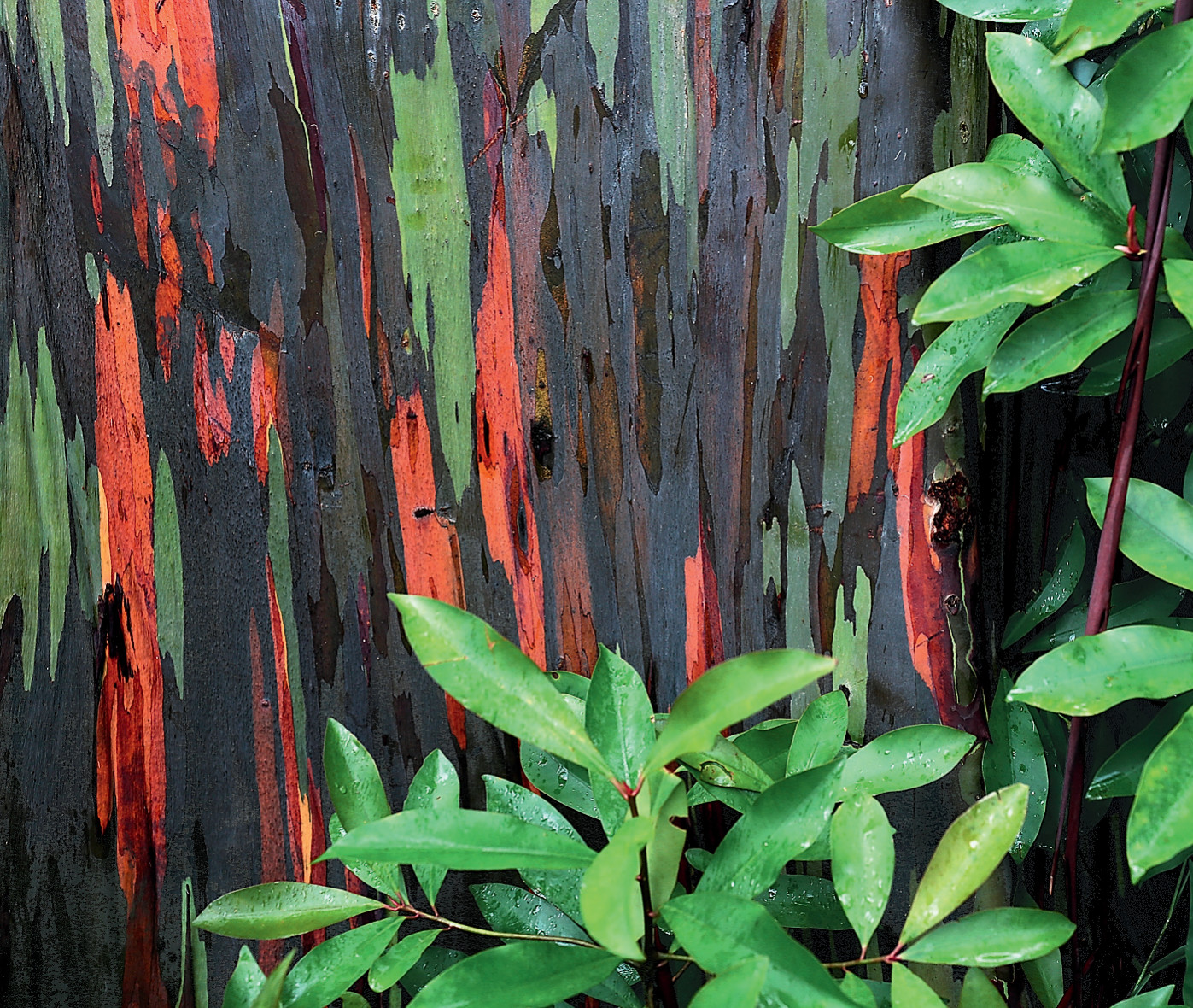 - Эвкалипт радужный, растущий в Новой Гвинее, Минданао, Малайе и других тропических землях, отличается разноцветьем своей коры. У молодого деревца кора зелёная, но с ростом (а дерево достигает в высоту 75 м при диаметре ствола до 2,4 м) она приобретает синие, фиолетовые, оранжевые и красные полосы. Здесь показан участок коры дерева с острова Мауи, Гавайи.