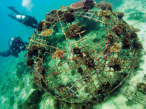 Над проблемой задумался американский биолог Том Горо — и разработал метод создания искусственных рифов. Попытки были и раньше: так, в 70-х годах прошлого века в 2 км от берега Флориды (США) на глубине 20 м создали риф площадью 150 000 м2 из более двух миллионов старых покрышек в надежде, что на них поселятся морские организмы. Но уже через несколько лет штормá разбросали плохо закреплённые покрышки, причём от них пострадали соседние натуральные рифы. Вдобавок из резины в морскую воду поступают ядовитые вещества. Такие же неудачи с рифами из покрышек потерпели Индонезия и Малайзия.