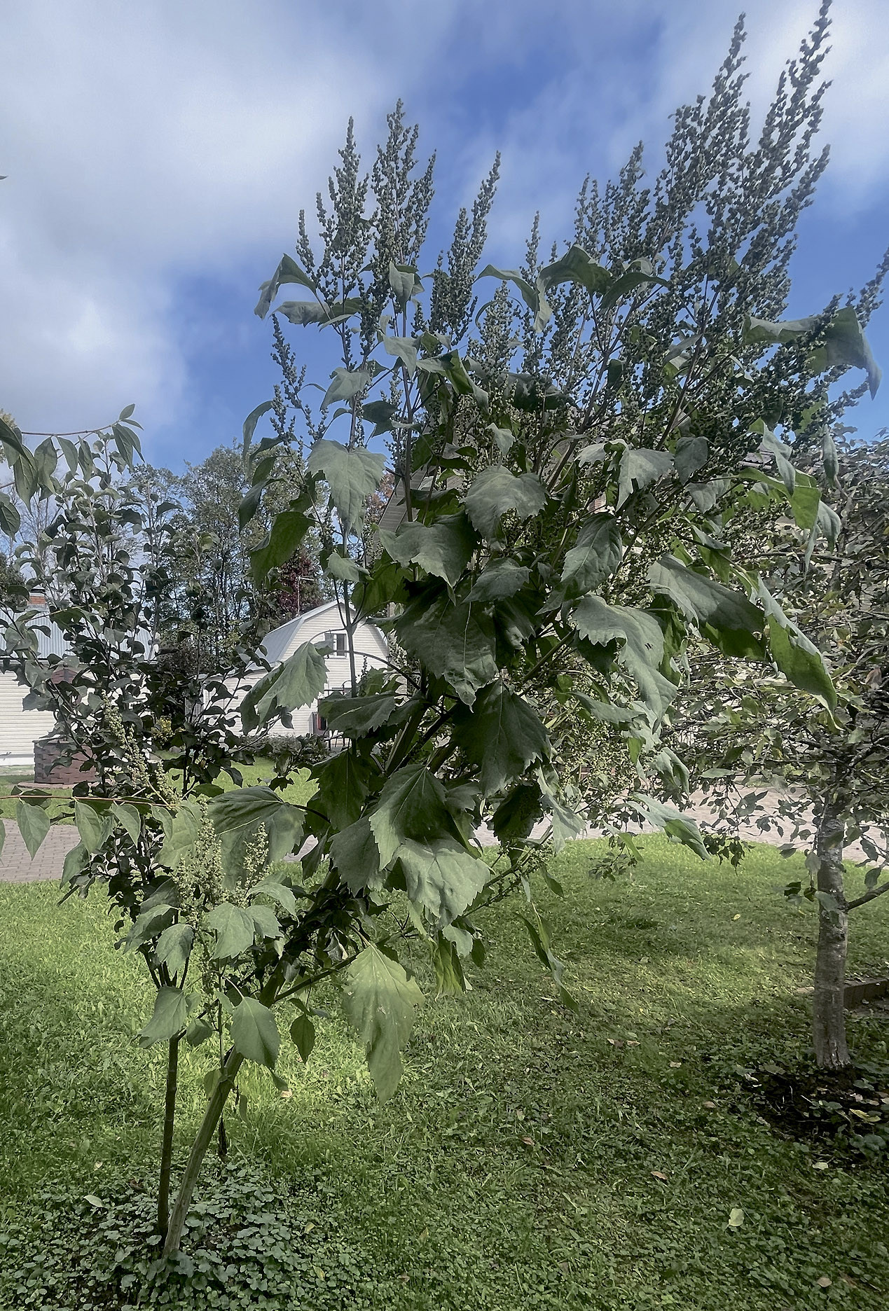 Весной этого года мы посадили в саду молодую яблоньку. Саженец прижился и пошёл в рост. Через некоторое время рядом со штамбом деревца, почти вплотную к нему, появился внушительный росток. Растение быстро набирало силу, стебель утолщался и утолщался. В росте оно намного обгоняло яблоньку. Внешне напоминает лебеду, но огромную. Прямо диковинных размеров! Растение кустилось, на нём появлялись очень большие листья и множество кистей с многочисленными соцветиями.