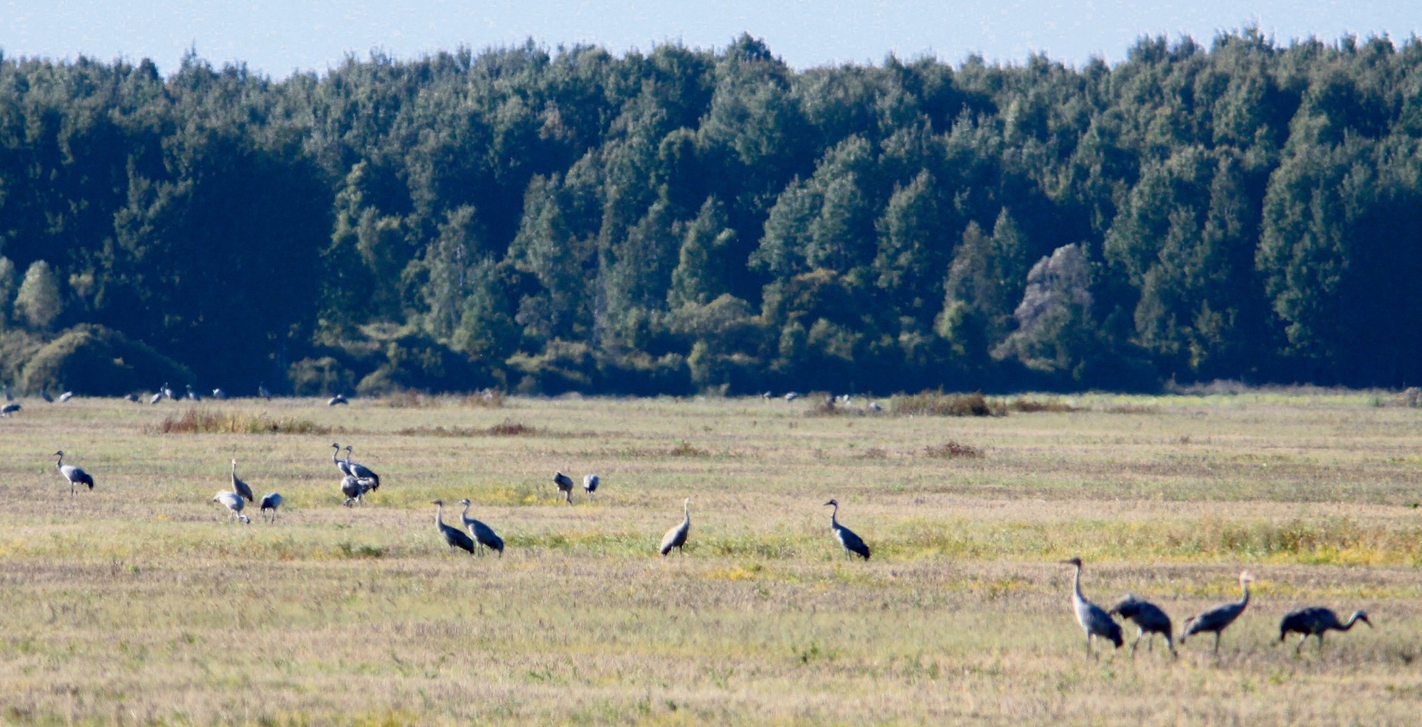 Мы взяли бинокли. Видим — вдалеке какие-то серовато-коричневые палки из земли торчат… Шевелятся! Да это же журавли! Настоящие, серые! Переводим бинокли с окраины поля на заросли кустарников… Повсюду птицы! Крылья расправляют, шеи вытягивают, что-то выискивают в пожухлой траве… Но видны только силуэты.
