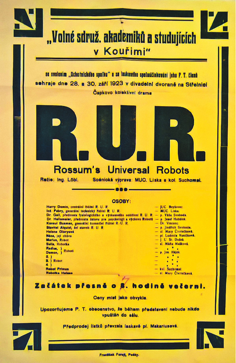 Слово «робот», обозначающее в наше время машину, способную на некоторые запрограммированные действия и иногда для развлекательных целей оформленную в виде механического человека, придумал чешский художник и литератор Йосеф Чапек по просьбе своего брата, писателя Карела Чапека. Карелу пришла в голову идея для новой пьесы, в которой действуют искусственно созданные рабочие. Нечто вроде людей, но не совсем люди. С этой задумкой он пришёл в мастерскую брата и пожаловался, что не может найти название для таких подобий человека. Карел хотел назвать их «лаборжами» — от английского слова labour — работа, труд. Художник, не отрываясь от полотна, которое усердно грунтовал, предложил слово «роботы» — от чешского слова robota, то есть принудительный труд, барщина и даже каторга (обычный труд, работа по-чешски práce). А пьесу, премьера которой состоялась в Праге 25 января 1921 года, автор назвал «R.U.R.» от названия фирмы, выпускающей роботов: Rossumovi univerzální roboti — «Россумские универсальные роботы».