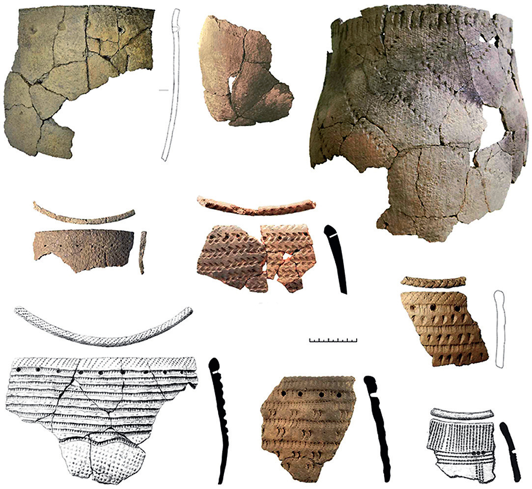 Фрагменты керамических сосудов, со стенок которых отбирали образцы. Иллюстрация из статьи: Бердников И. М. и др. Профиль и изотопный состав жирных кислот в пищевой корке керамических сосудов неолита Приангарья и западного побережья оз. Байкал как индикатор пищевого рациона древнего человека // Журн. СФУ. Биология, 2025. 18(4). С. 432—450.