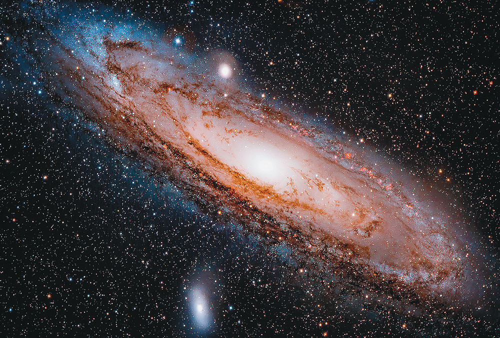 Год назад рассказ был о достопримечательностях созвездия Кассиопеи («Время Кассиопеи. Осеннее небо», «Наука и жизнь» № 9, 2020 г.), а в этот раз поговорим о созвездии Андромеды (латинское сокращение And). Оно достаточно большое, занимает по площади девятнадцатое место из 88, а по количеству видимых невооружённым глазом звёзд (ярче 6m) даже делит 12—16 места. Правда, лишь три самые яркие имеют вторую звёздную величину, причём расположены они примерно на одной прямой, не образуя характерной фигуры. Так что поиск созвездия Андромеды на небе проще всего начинать с нахождения на южной стороне так называемого Большого квадрата Пегаса — четырёх самых ярких звёзд этого созвездия, расположенных в вершинах воображаемого квадрата. Северо-восточной его вершиной служит звезда Альферац (α And), которая ранее принадлежала обоим созвездиям (даже полное её арабское название переводится как «пуп коня»). От неё далее на северо-восток, параллельно диагонали квадрата, и протянулась главная цепочка звёзд Андромеды.