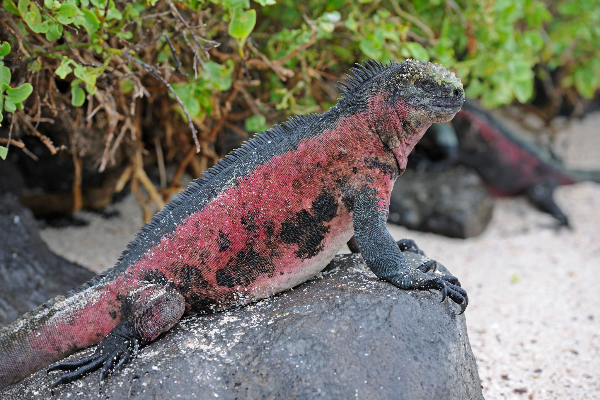 Эта удивительная рептилия обитает на Галапагосских островах. В длину достигает 140 сантиметров. На спине животного находится гребень, состоящий из острых шипов. Лапы игуаны вооружены острыми когтями. Всё это ей придает сходство с драконом. Но, в отличие от мифического чудища, она абсолютно безопасна для человека, питается морскими водорослями.