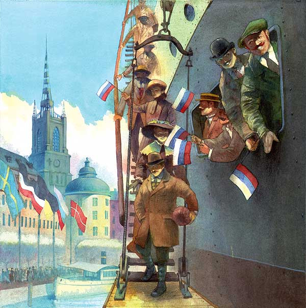 Вечером 25 июня 1912 года (все даты по н. ст.) на набережной Петербурга было необычайно оживленно: толпа народа, национальные флаги, музыка, крики «ура!»… Так провожали наших спортсменов на Олимпийские игры в столицу Швеции. Это была первая Олимпиада, в которой они принимали участие официально, то есть при посредничестве Национального олимпийского комитета и поддержке правительства. Вез российскую сборную огромный четырехпалубный океанский пароход «Бирма». «Редкое зрелище представляла „Бирма“, — вспоминал атлет Людвиг Чаплинский, — здесь собрался весь цвет русской молодежи, надежда нации. Повсюду сухие мускулистые тела, искрящиеся силой и здоровьем…»