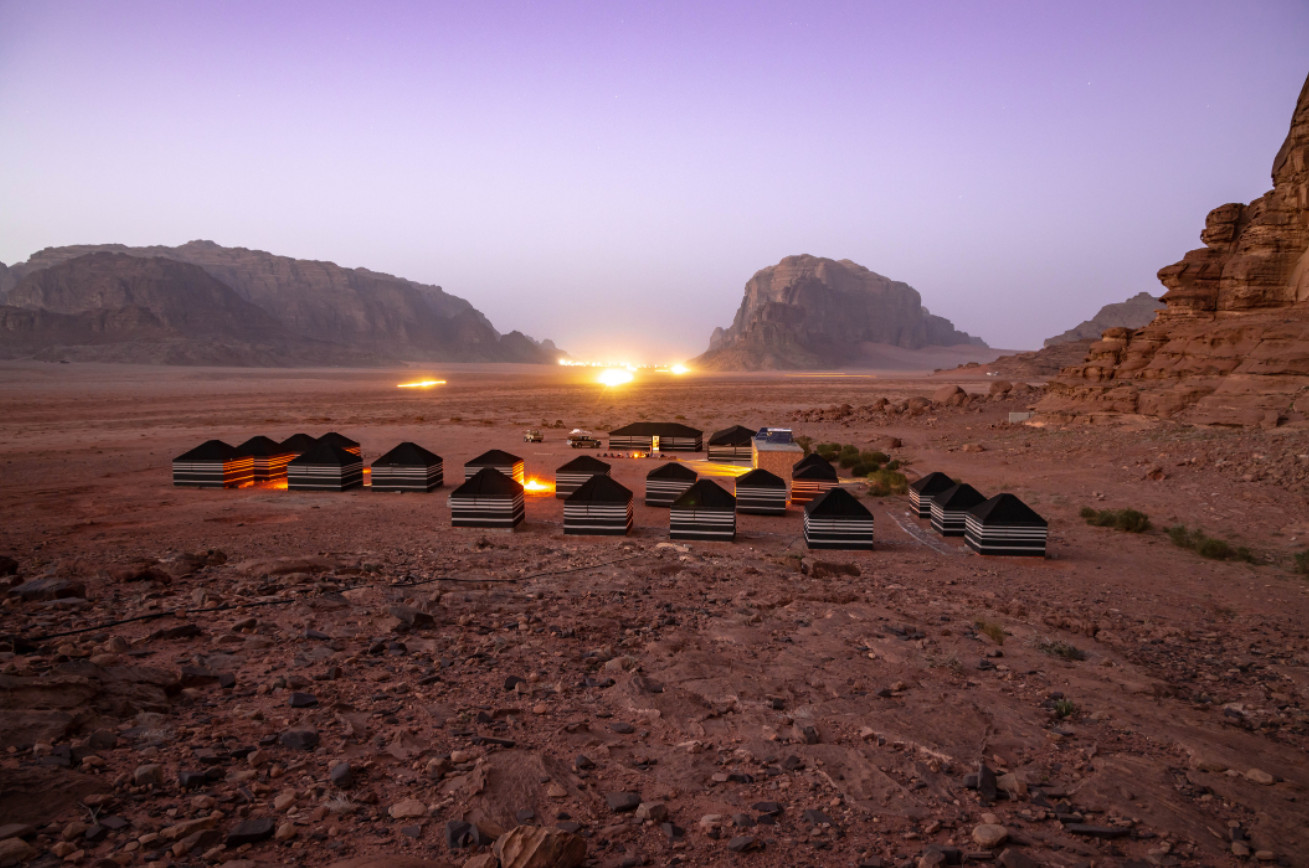 Что-то отдаленно напоминающее глэмпинг я впервые увидела несколько назад в Иордании, в «марсианской» пустыне Вади-Рам. На красных песках были расставлены высокие полосатые шатры, внутри виднелись застеленные белоснежным бельем кровати под балдахинами и какая-то мебель.