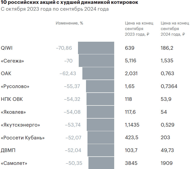 За период с конца сентября прошлого года по 30 сентября этого года падение стоимости продемонстрировали большинство акций, торгующихся на Мосбирже, — 196 из 235. Из них «РБК Инвестиции» выбрали десять худших: это бумаги, которые упали в цене на 50–70%. Среди них — как низколиквидные акции, стоимость которых разгонялась, а затем стремительно падала на ожиданиях малозначимых для рынка корпоративных событий, так и бумаги, за которыми активно следит рынок.
